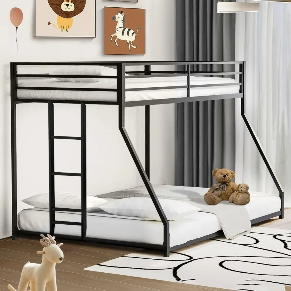Litera, cama de dormitorio, litera doble sobre completa, literas de metal, escalera lateral extraíble de perfil bajo y fondo completo, color negro