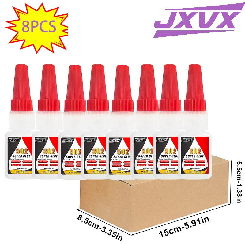 1/8 Uds JXVX 502 súper pegamento de cianoacrilato de secado rápido adhesivo instantáneo fuerte para materiales de reparación Industrial de oficina en casa, Herramienta líquida potente y transparente, 20 g