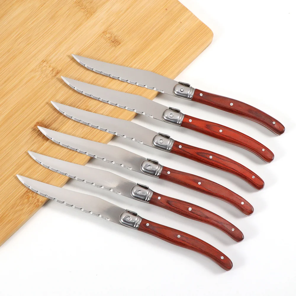 Jaswehome Juego de cuchillos de acero con mango de madera, 6 uds., cuchillos de dientes de sierra de acero inoxidable, juego de cubiertos occidentales, juego de vajilla con cuchillo para barbacoa