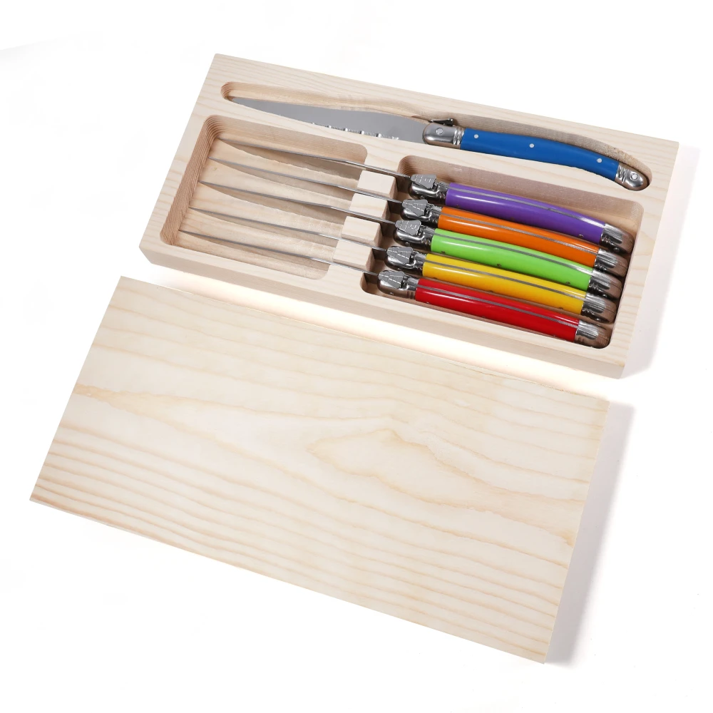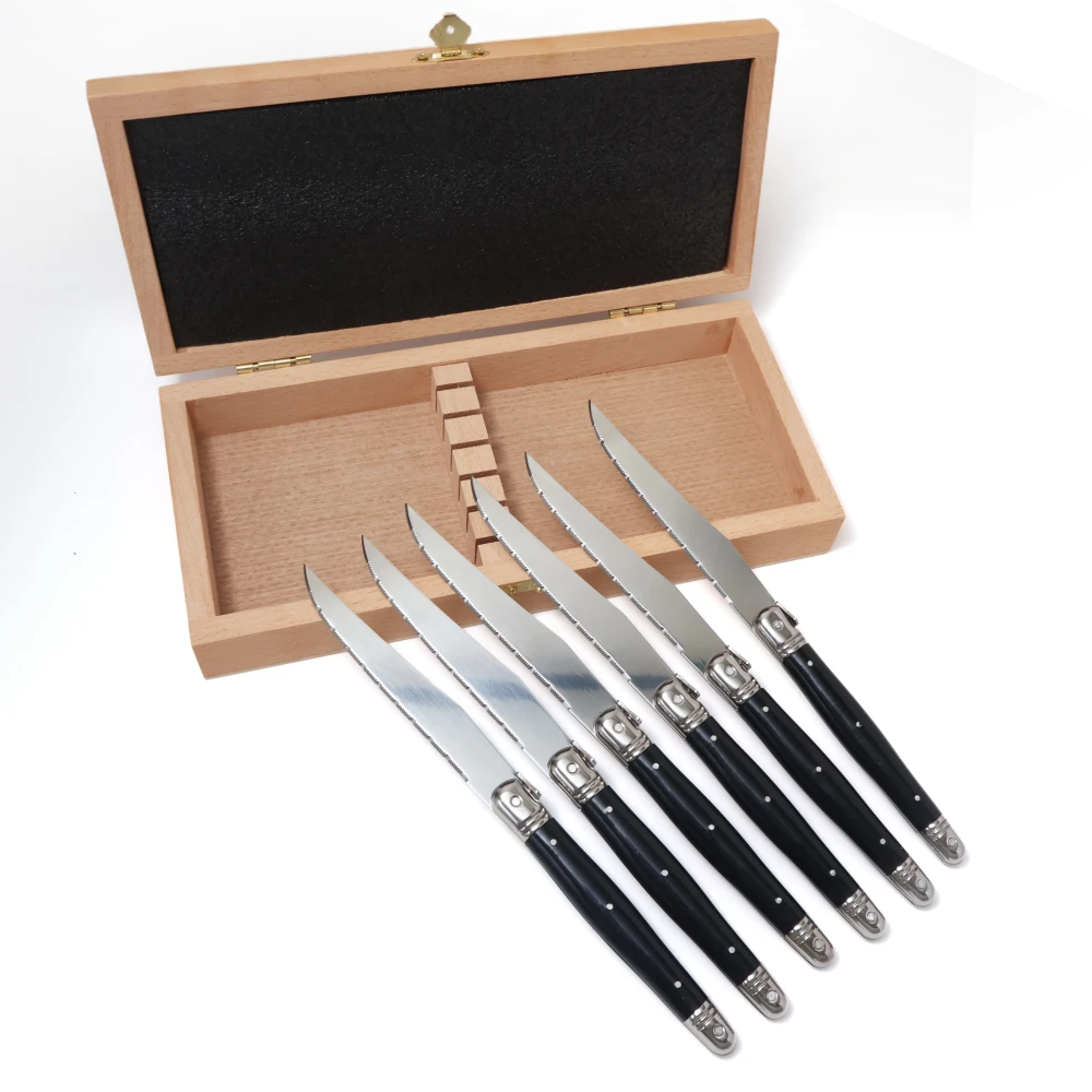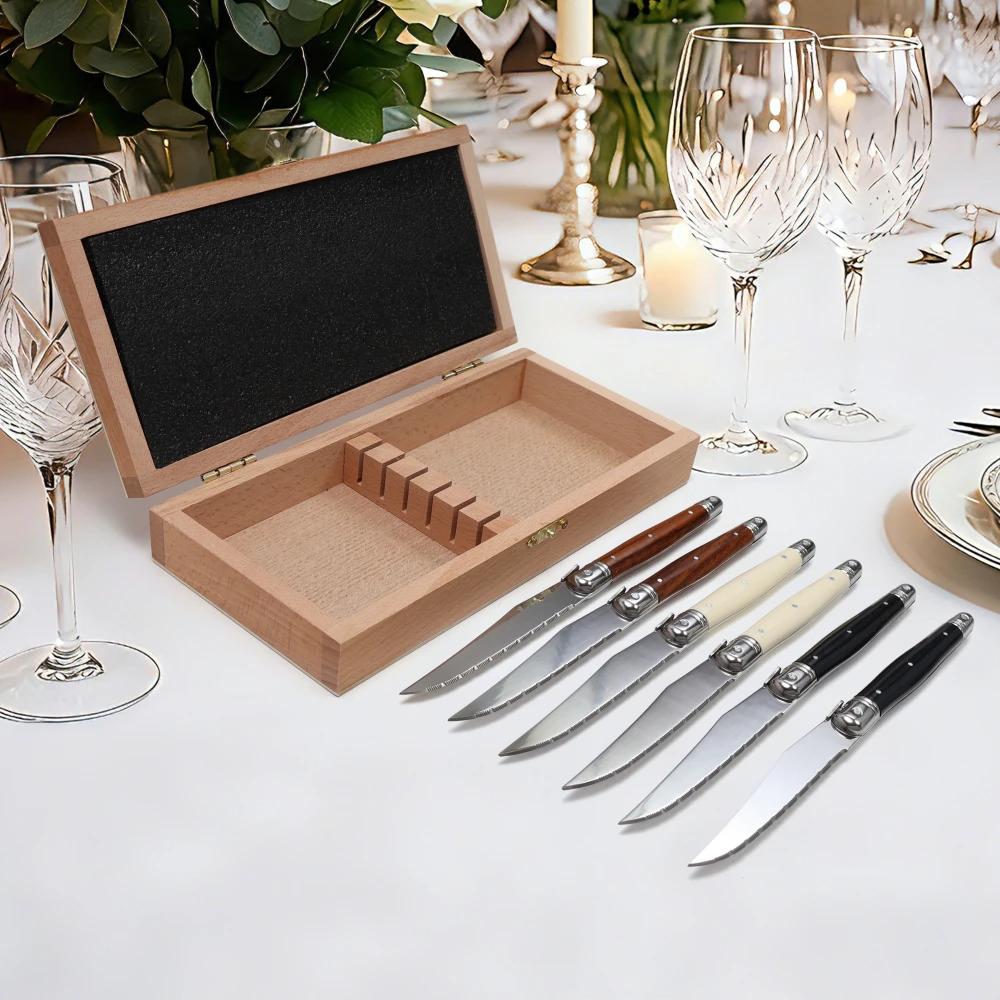 Jaswehome, juego de 6 cuchillos para cenar con caja de PVC de pino, cuchillo para cortar carne de acero inoxidable, cuchillo para carne occidental, cuchillo con dientes de sierra, juego de vajilla
