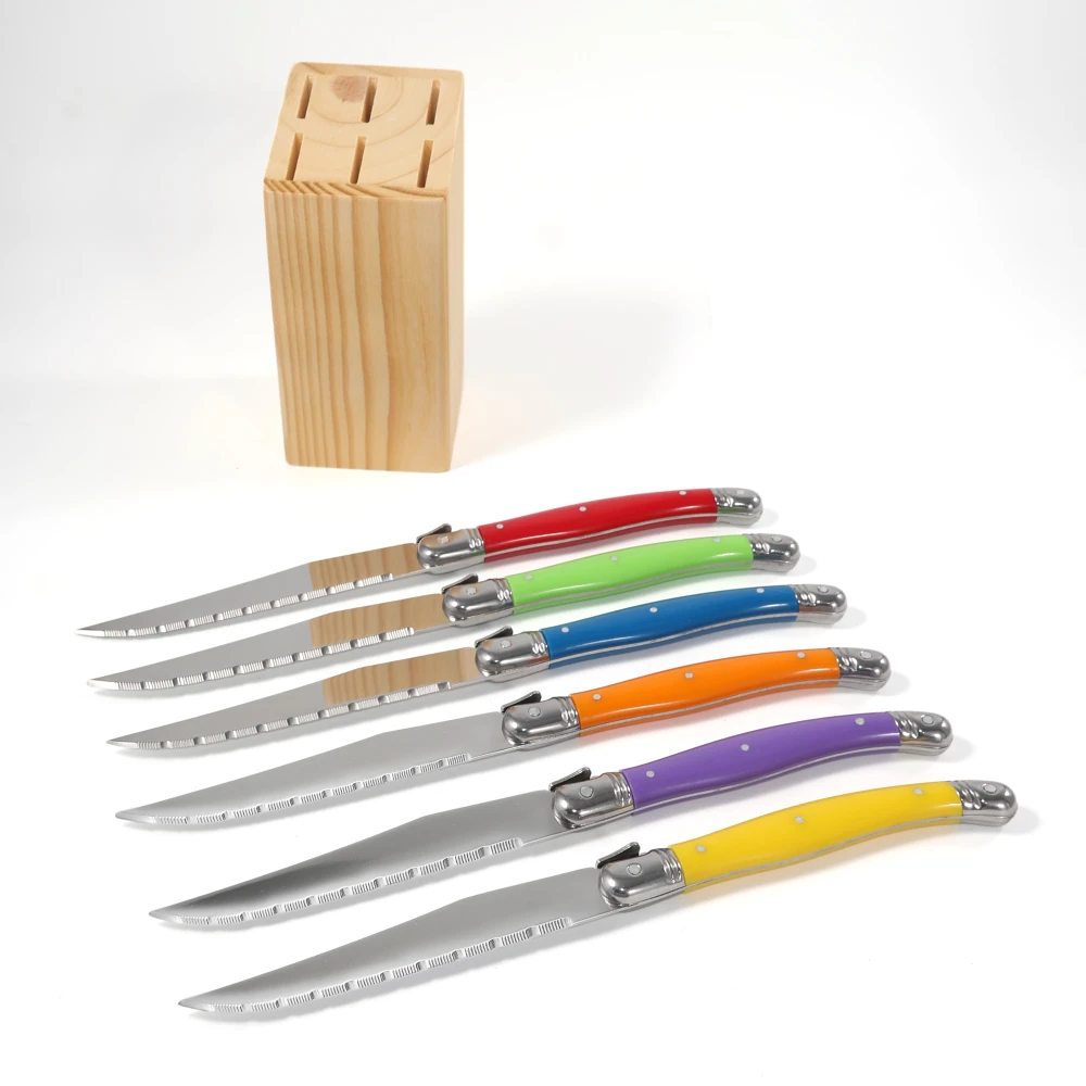 Jaswehome Juego de 6 Cuchillos para Carne Laguiole de Acero Inoxidable con Soporte de Madera, Cuchillos de Cena Dentados, Cuchillos para Carne Estilo Occidental