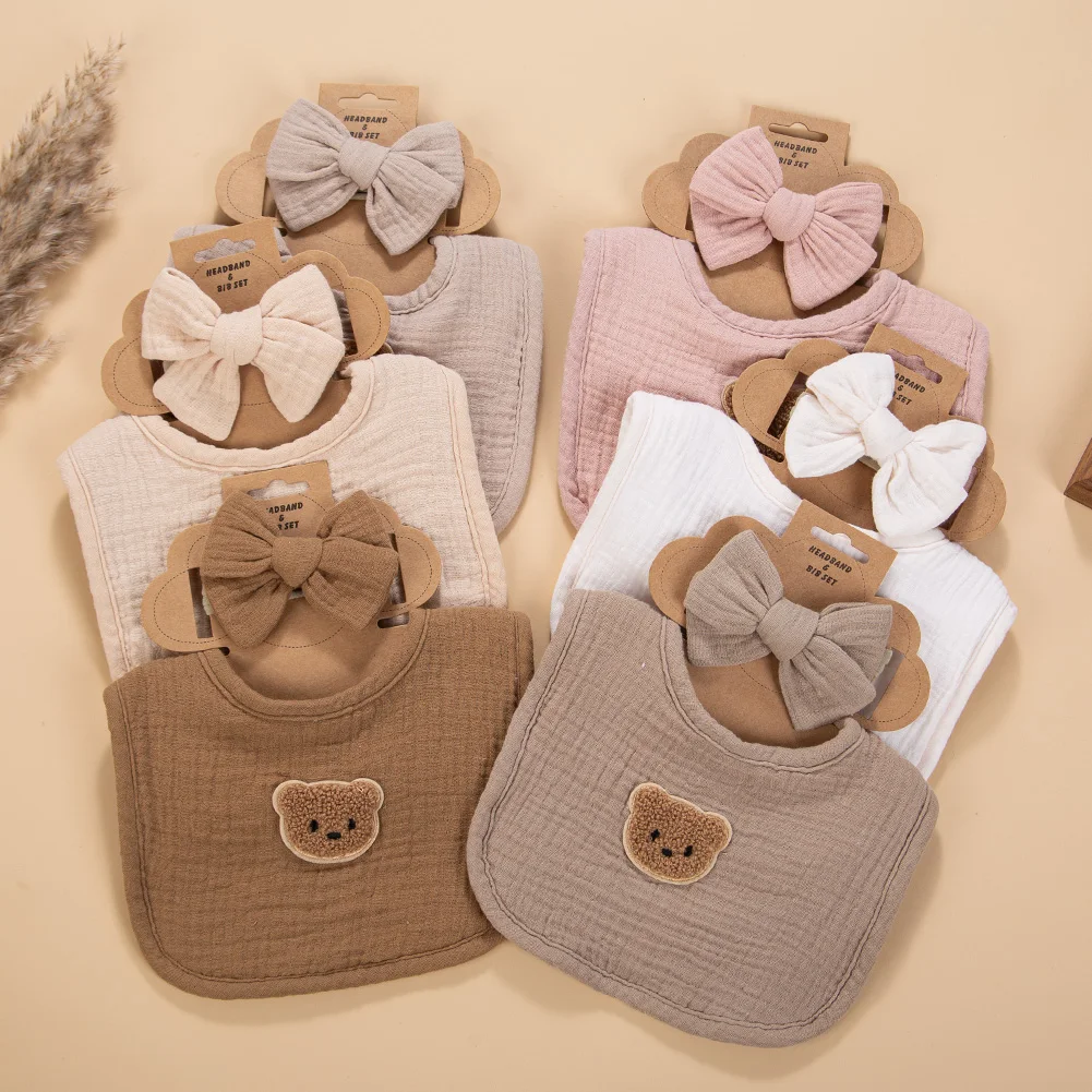 2 unids/set de diademas de nailon y algodón de muselina con lazo grande, Baberos de gasa para bebé, toalla de oso bonito, Saliva, alimentación de recién nacido, colths para eructar, sombreros para niños