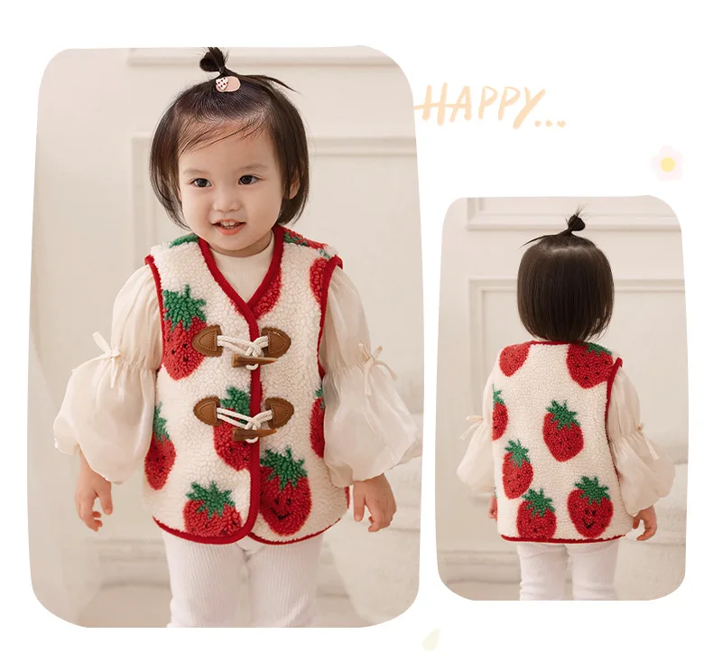Chaleco Infantil Primavera-Otoño 2026, 100% Algodón, Bordado de Fresa, Unisex, para Niños Pequeños, Tejido sin Mangas, Suéteres, 1-7 Años