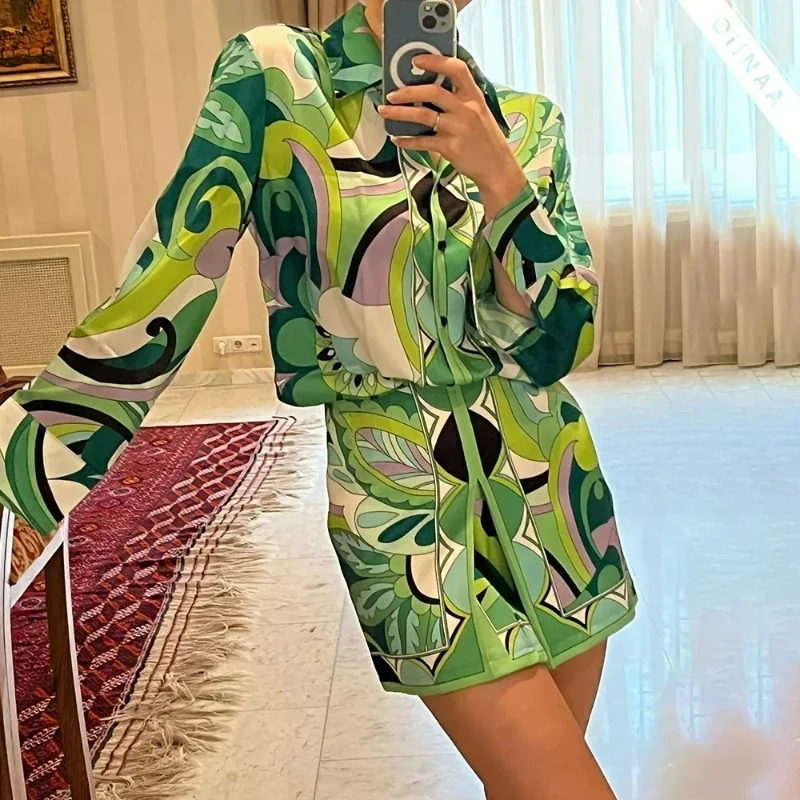 Conjuntos de falda de verano para mujer, Tops a la moda, camisa de manga larga con estampado de plantas y flores, falda acampanada de cintura alta, conjuntos de playa bohemios, falda Y2k
