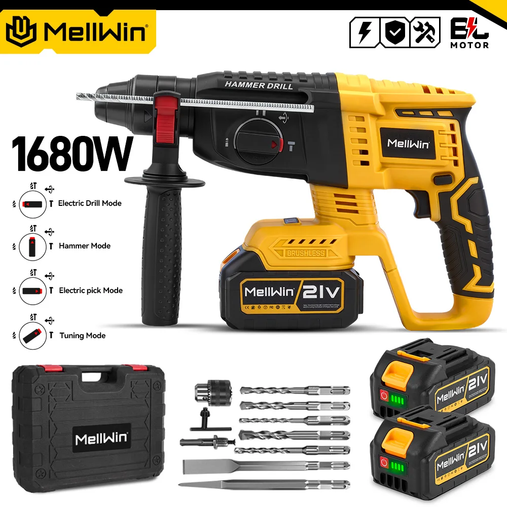 MELLWIN-taladro eléctrico sin escobillas 3 en 1, martillo de impacto multifunción para acero, hormigón, madera, Pin de batería Makita de 18V