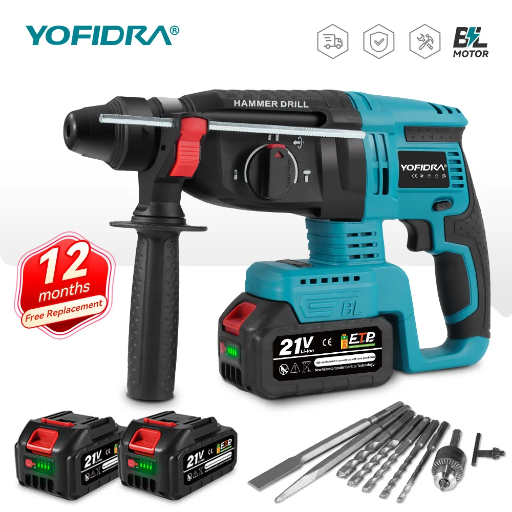 YOFIDRA-martillo eléctrico sin escobillas de 1680W, taladro de impacto multifunción inalámbrico, herramienta eléctrica rotativa para batería de 21V y 18V