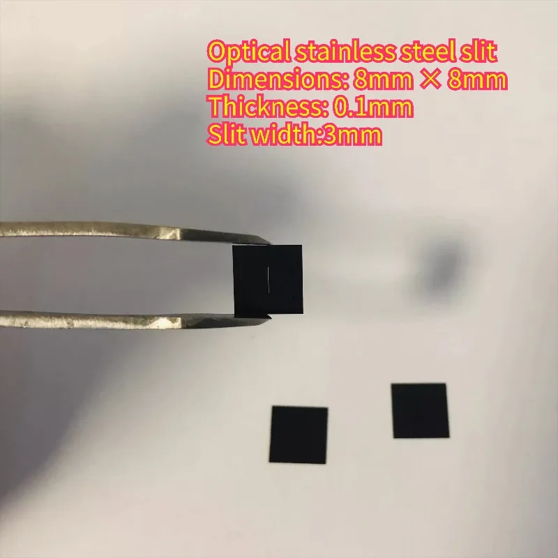1 unidad de hendidura óptica de acero inoxidable de 8x8x0,1mm, ennegrecimiento de 50 micras de ancho, longitud de hendidura de 3mm para experimento de difracción de un solo hendidura
