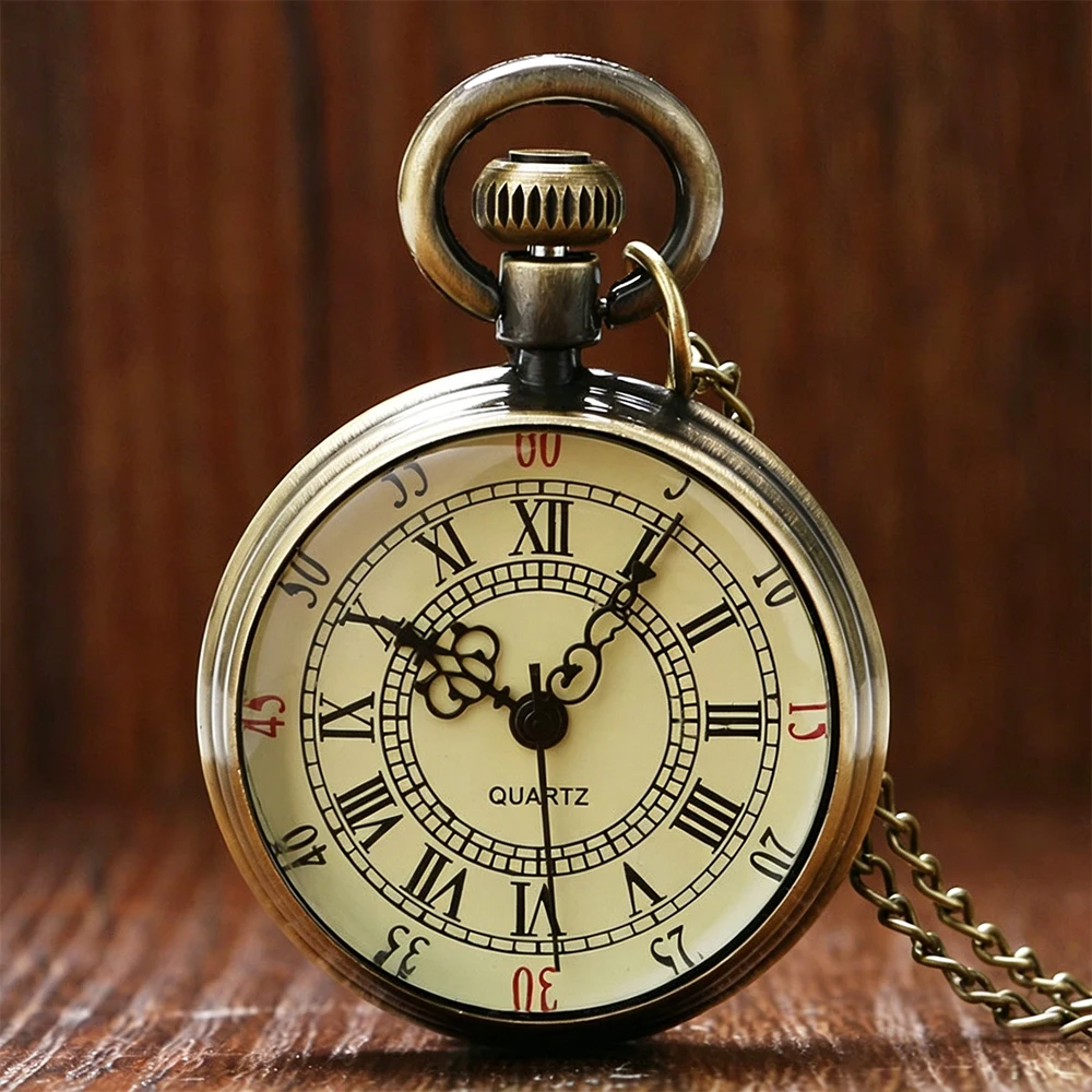 Reloj de Bolsillo Vintage con Números Romanos, Movimiento de Cuarzo, Reloj Colgante con Cadena