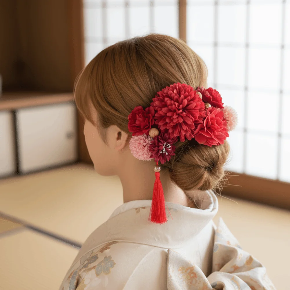 Joyería, horquillas para el cabello de flores de estilo japonés, pinzas para el cabello de kimono japonés con flores hechas a mano, borlas Vintage de tela, palo para el cabello para niñas