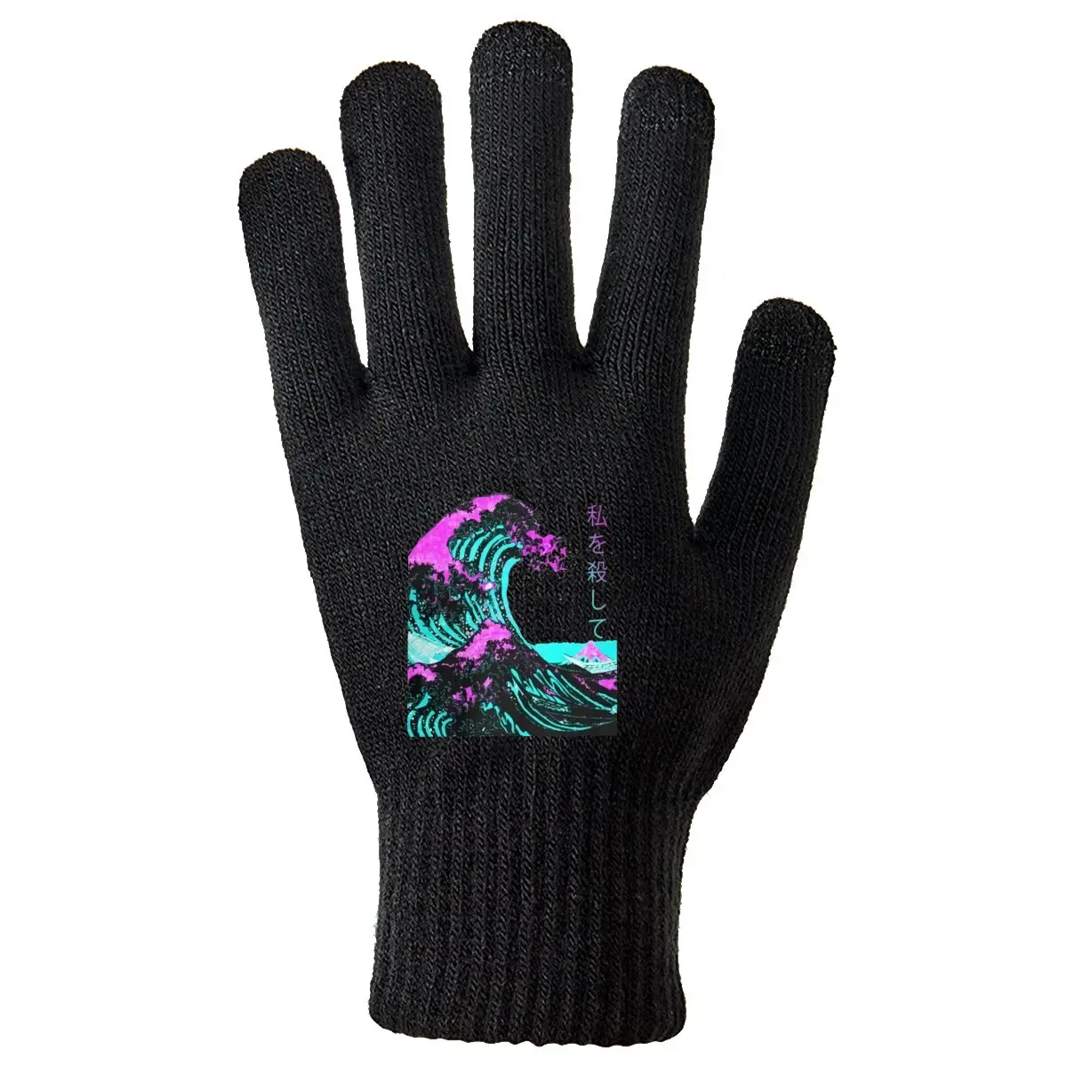 Guantes deportivos al aire libre de invierno con gráfico temático de texto japonés, gran ola moderna, antideslizantes, cálidos para senderismo