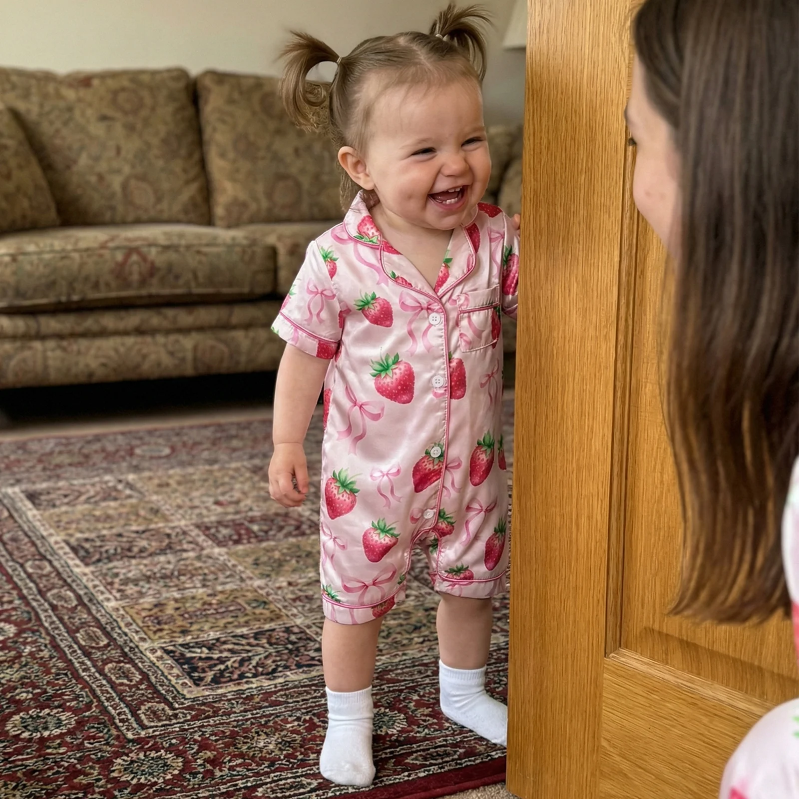 Pijama de verano para bebé niña con estampado de fresas, lazo, botones, cuello en V y manga corta