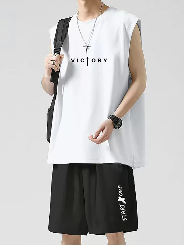 Conjunto de 2 Piezas de Moda Masculina, Chaleco sin Mangas y Pantalones Cortos de Cinco Puntos, Ropa Deportiva Versátil para Uso Diario y al Aire Libre en Verano