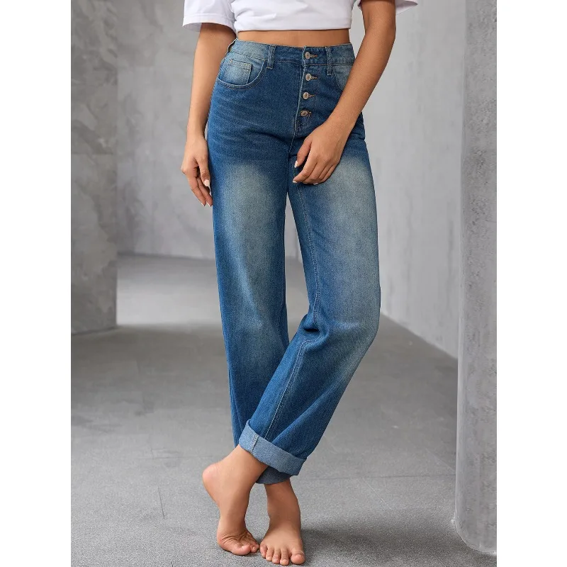 Pantalones Vaqueros de Mujer de Cintura Alta y Pierna Recta, Estilo Vintage con Botones, Holgados, Informales, para Primavera-Otoño 2026