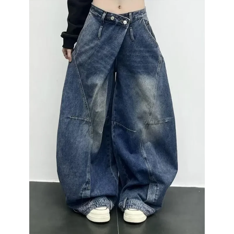 Jeans Vintage Y2K Estilo Grunge para Mujer, Vaqueros Holgados Lavados con Bolsillos Asimétricos y Botones, Estilo Harajuku, Casual para el Día a Día