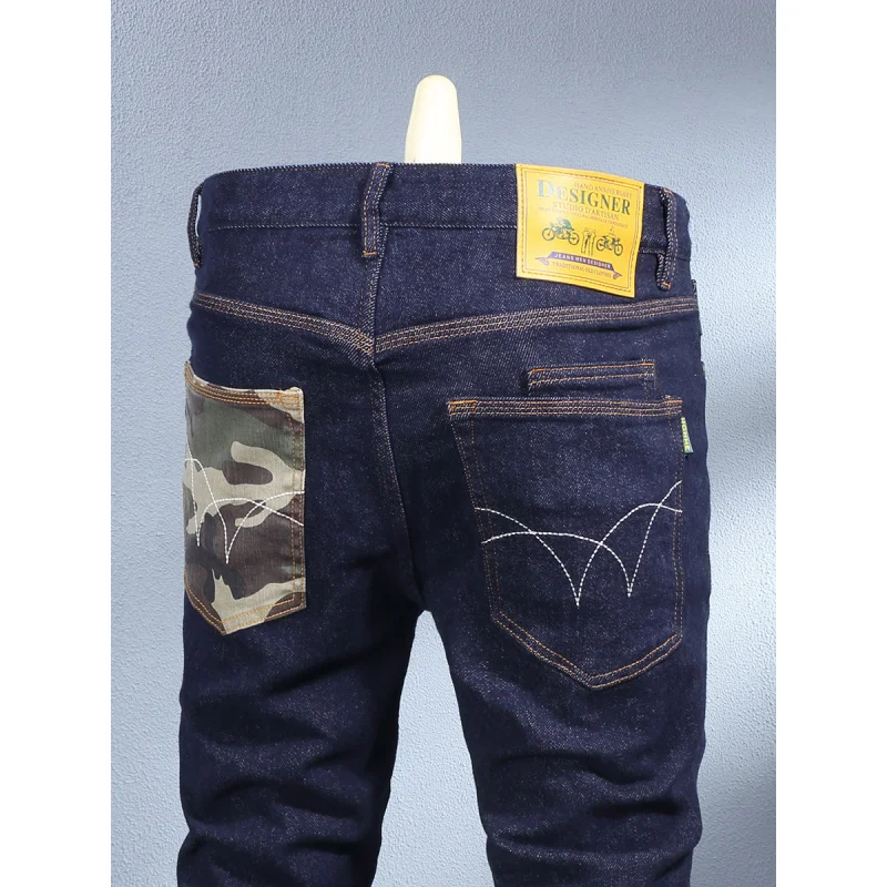 Pantalones vaqueros elásticos ajustados para hombre, ropa de calle, pantalones casuales clásicos, ropa vaquera ajustada con cremallera, ropa de diseñador en negro y azul
