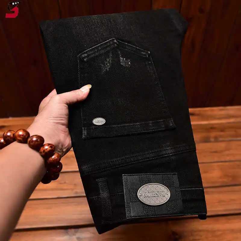 Pantalones vaqueros americanos de alta gama para hombre, con estampado bordado, negros, de corte ajustado, elásticos, a la moda, tendencia de otoño.