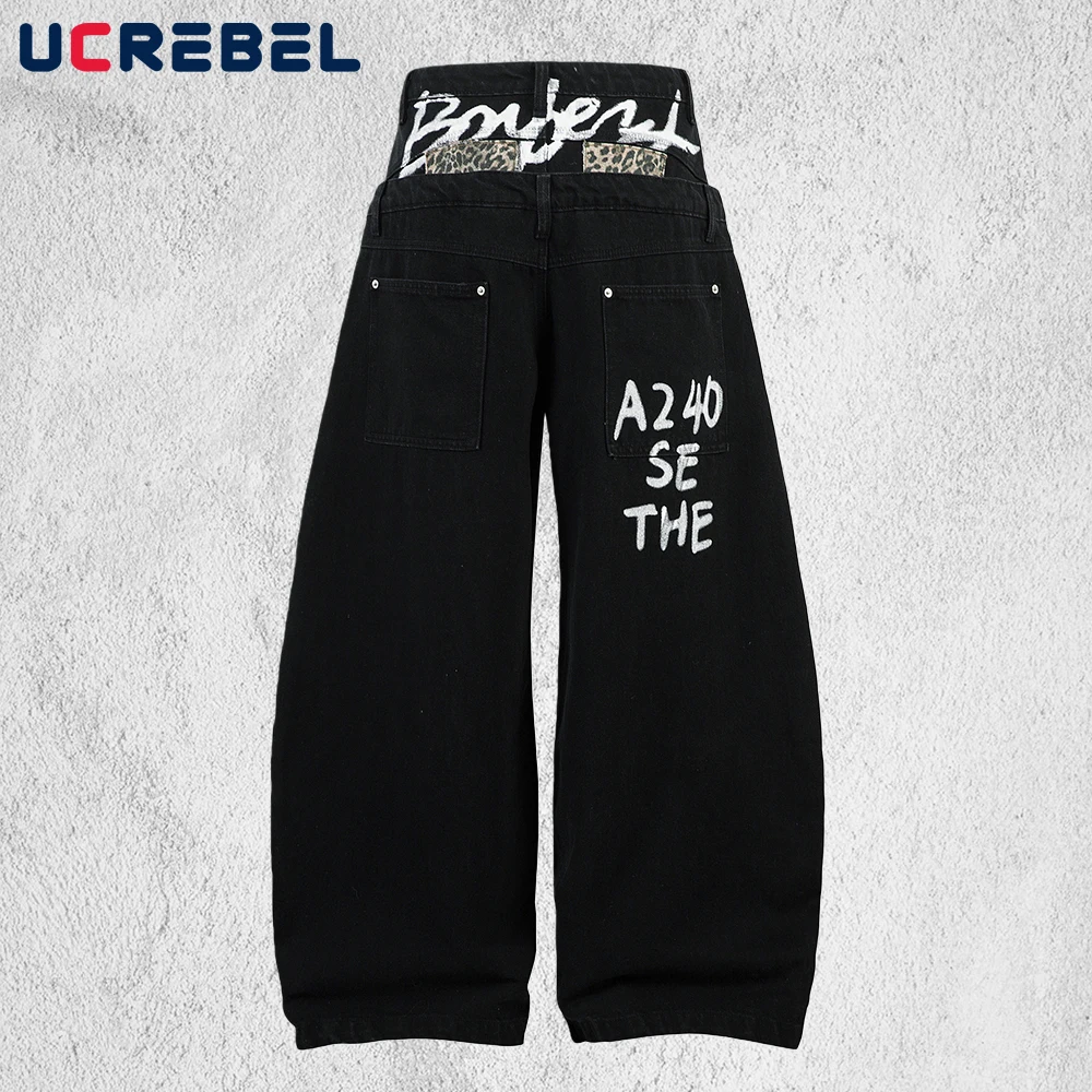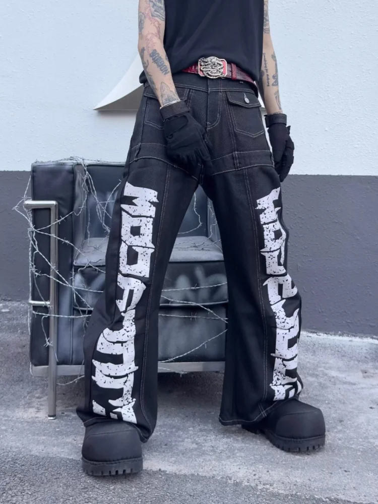 2025 pantalones vaqueros holgados negros con estampado de letras estilo Retro americano Y2K, ropa para hombre, ropa de calle de pierna ancha, pantalones vaqueros New Rock