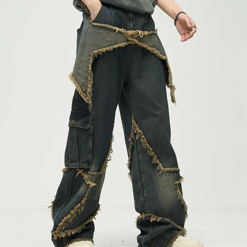 Pantalones vaqueros desgastados Vintage con estilo de estrella, ropa de pierna ancha para hombre, pantalones vaqueros con bolsillo, pantalones sueltos americanos de calle alta