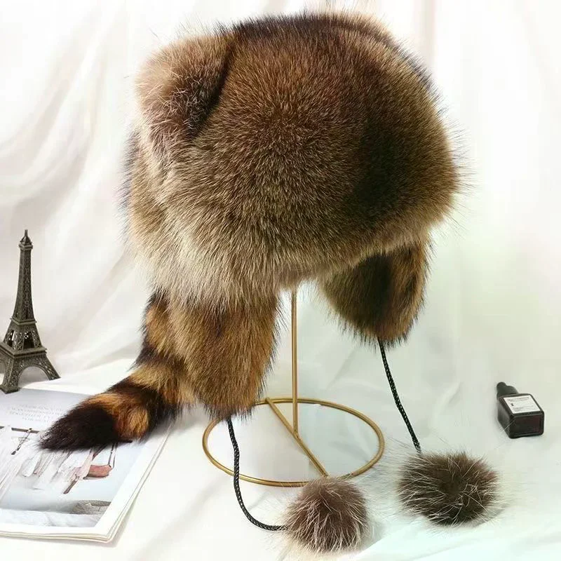 Gorro de bombardero de invierno para mujer con cola de mapache, orejeras de felpa, resistente al viento, cálido, a la moda, para exteriores, estilo ruso