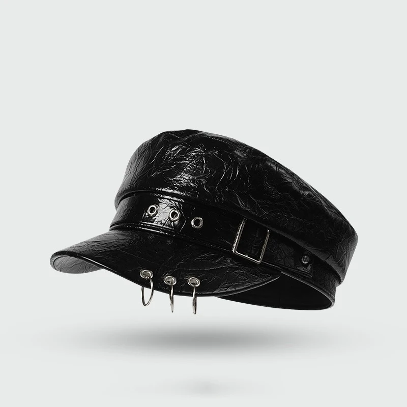 Gorra octogonal de charol negro para mujer, sombrero de marinero Retro Punk Y2K, boina de ocho paneles, ropa de calle elegante