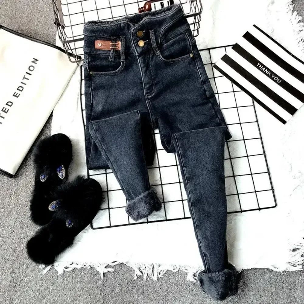 Jeans de invierno cálidos para mujer, jeans de terciopelo, pantalones elásticos ajustados de cintura alta con forro polar, leggings casuales de invierno para mujer.