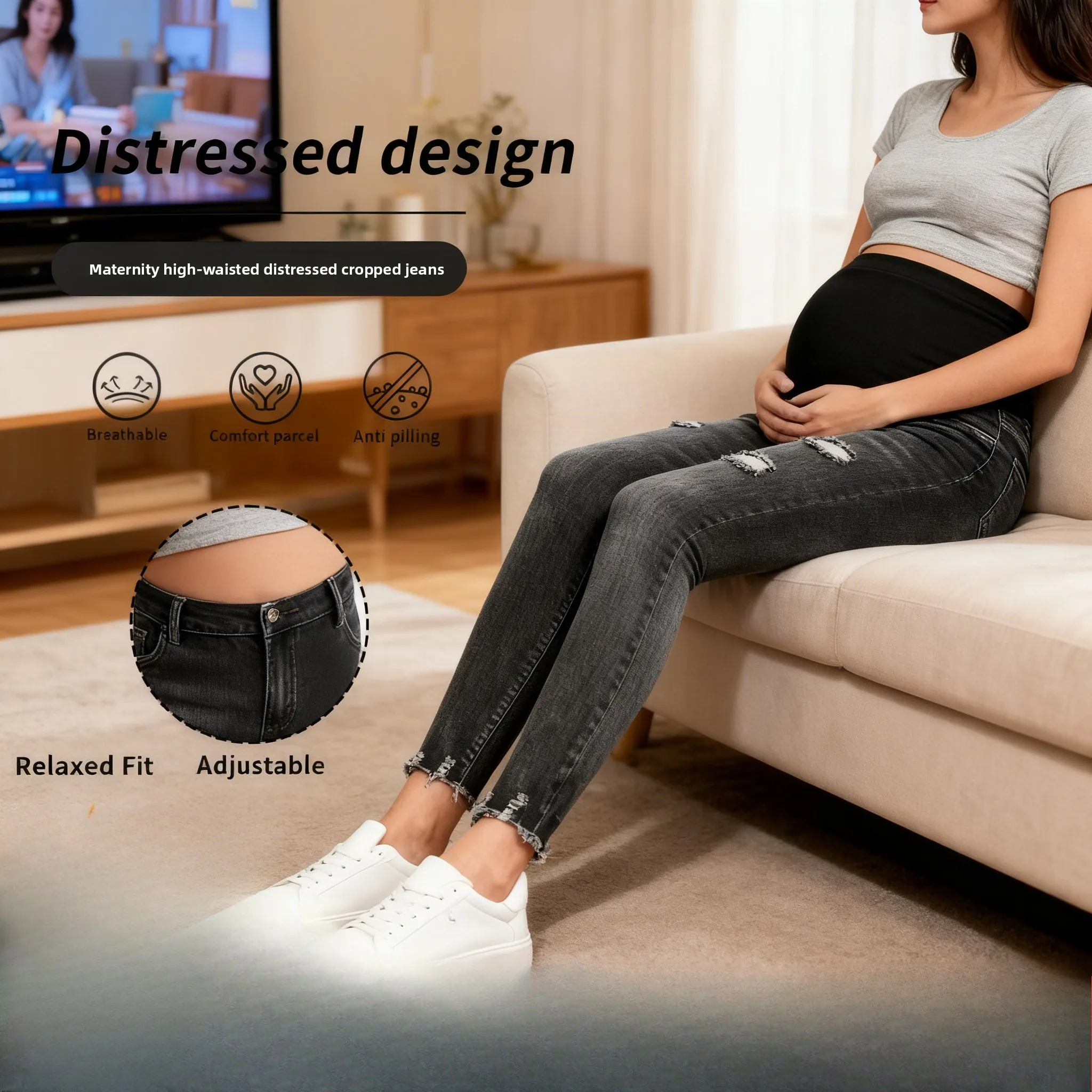 Jeans de Maternidad Finos de Verano, Ajustados, Cortos, Desgastados, Retro, Gris Claro, Sin Elásticos en el Vientre, para Mujeres Embarazadas