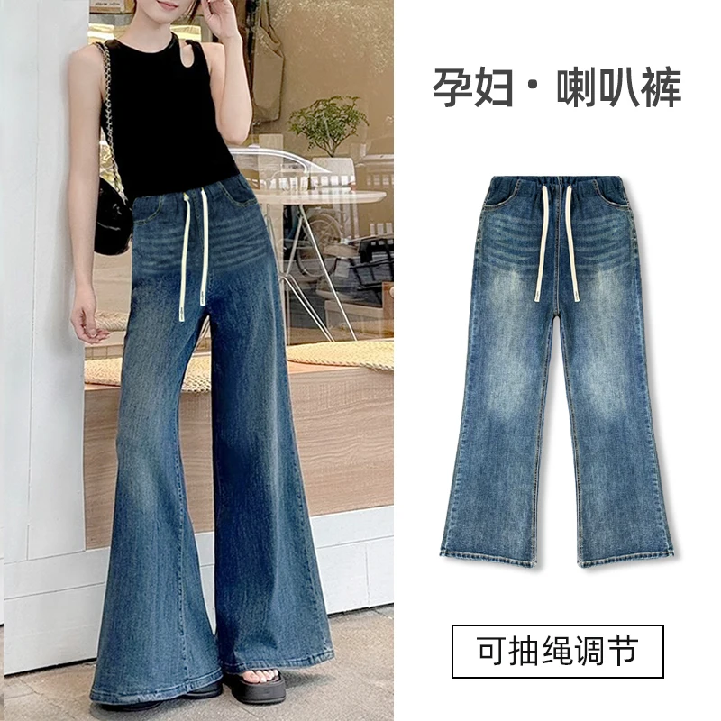 Vaqueros de mezclilla estilo coreano para embarazadas, primavera 2026, cintura alta, con cordón, holgados, rectos, corte bootcut, pantalones de maternidad