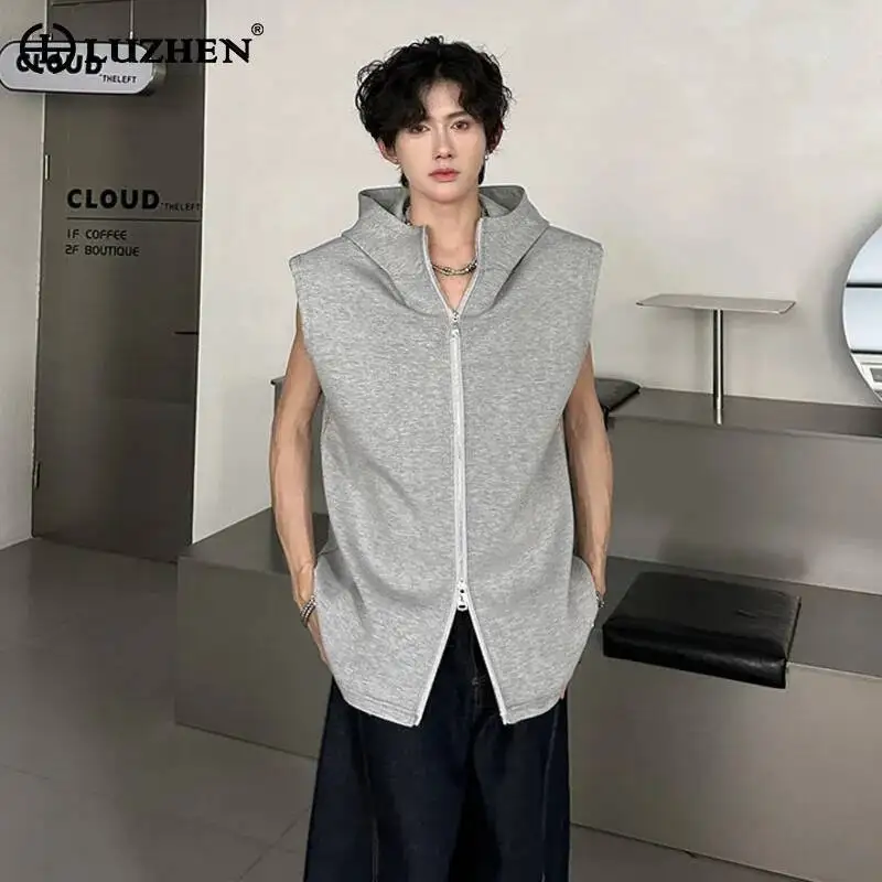 LUZHEN 2026 Nuevo Chaleco de Verano Original con Diseño de Doble Cremallera y Capucha, Camisa sin Mangas para Hombre, Elegante y de Color Sólido JY6452