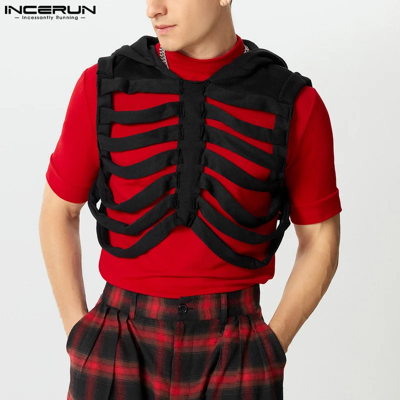 INCERUN, chalecos para hombre de retazos con capucha sin mangas, chalecos informales calados para hombre, ropa de calle, Tops cortos con personalidad, chalecos para hombre 2026