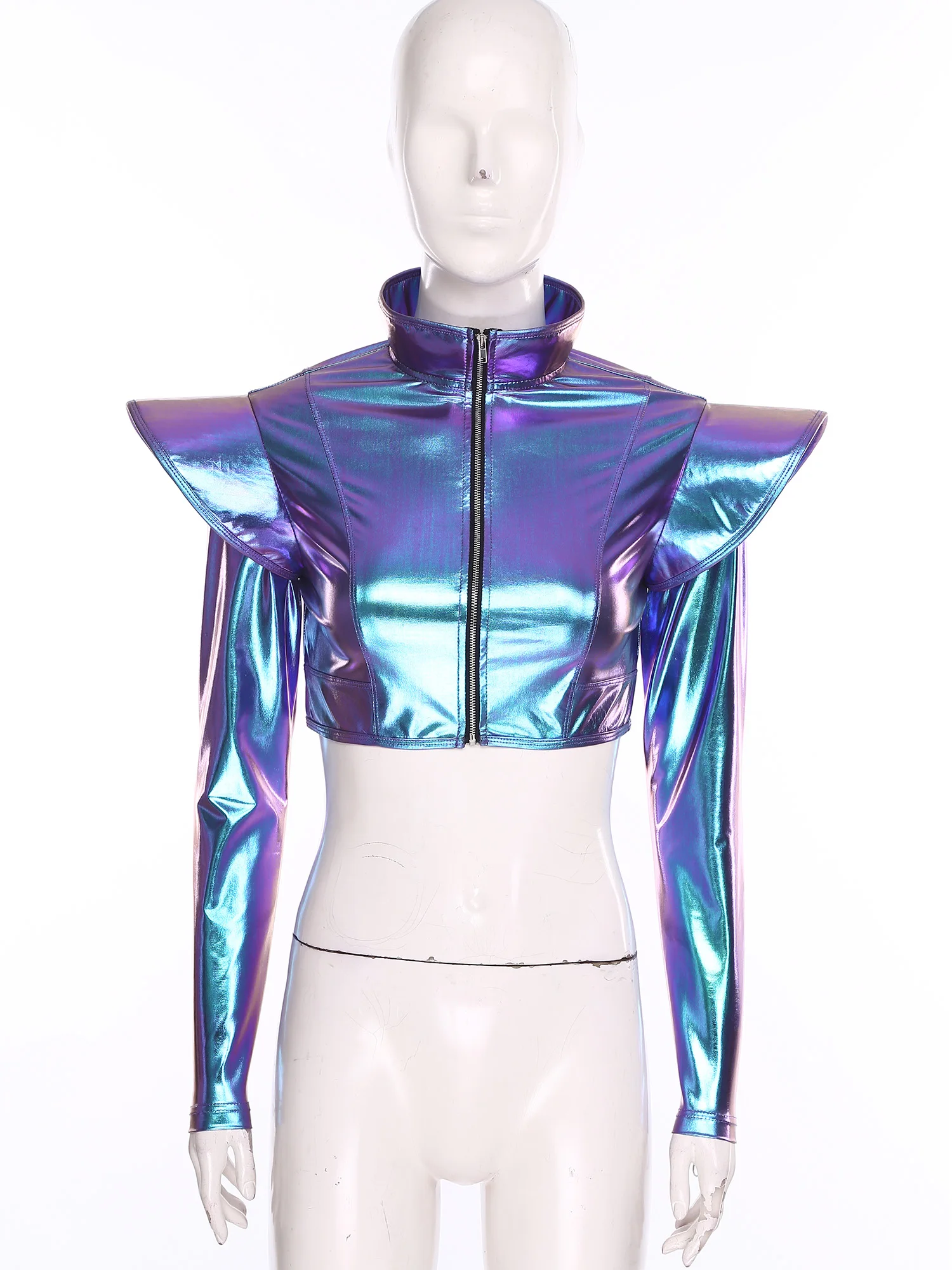 Chaqueta corta metálica brillante de manga larga para mujer, Top corto holográfico con cuello levantado y cremallera frontal, Top corto ajustado para fiesta Rave y discoteca