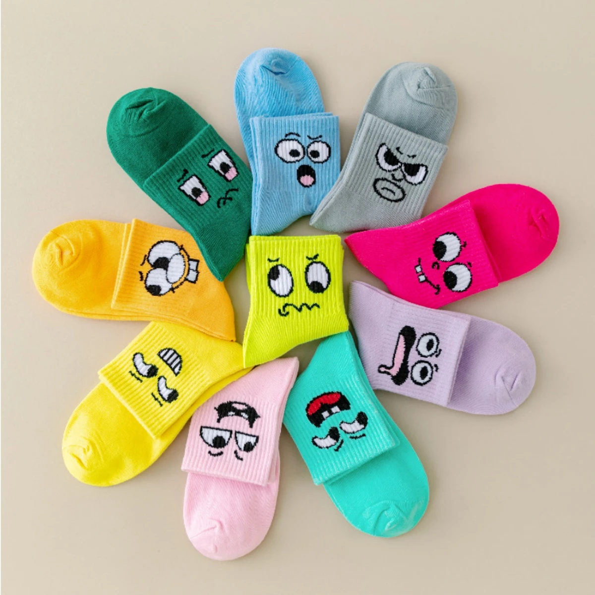 Calcetines de tripulación para mujer, diseño de cara sonriente de dibujos animados, colores dulces, modernos, lindos y únicos, cómodos, transpirables,