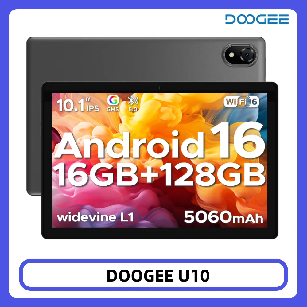 Tablet DOOGEE U10 con Pantalla HD de 10.1 Pulgadas, Android 16, 16 GB de RAM, 128 GB de ROM, Batería de Gran Capacidad de 5060 mAh, Widevine L1, WiFi6, 8MP+5MP, Pad PC
