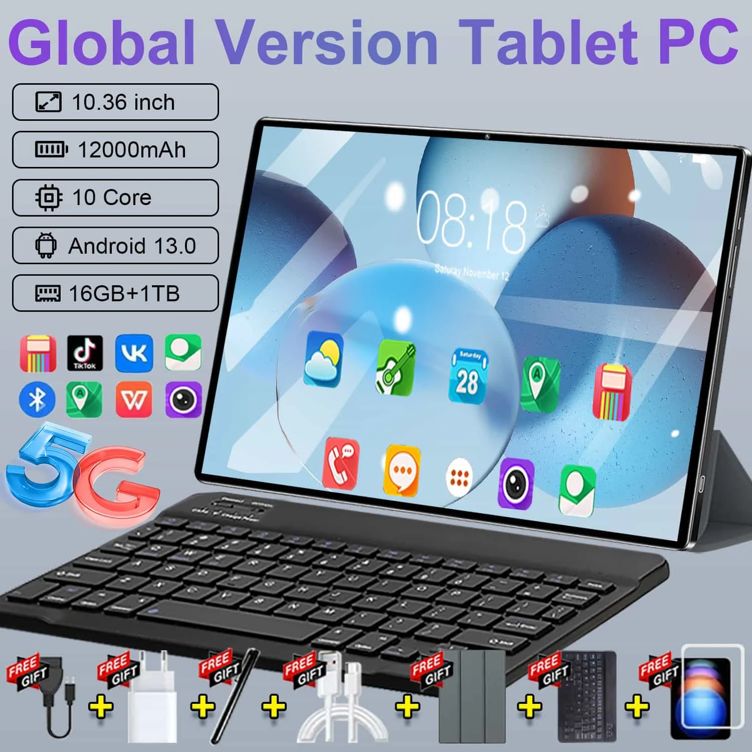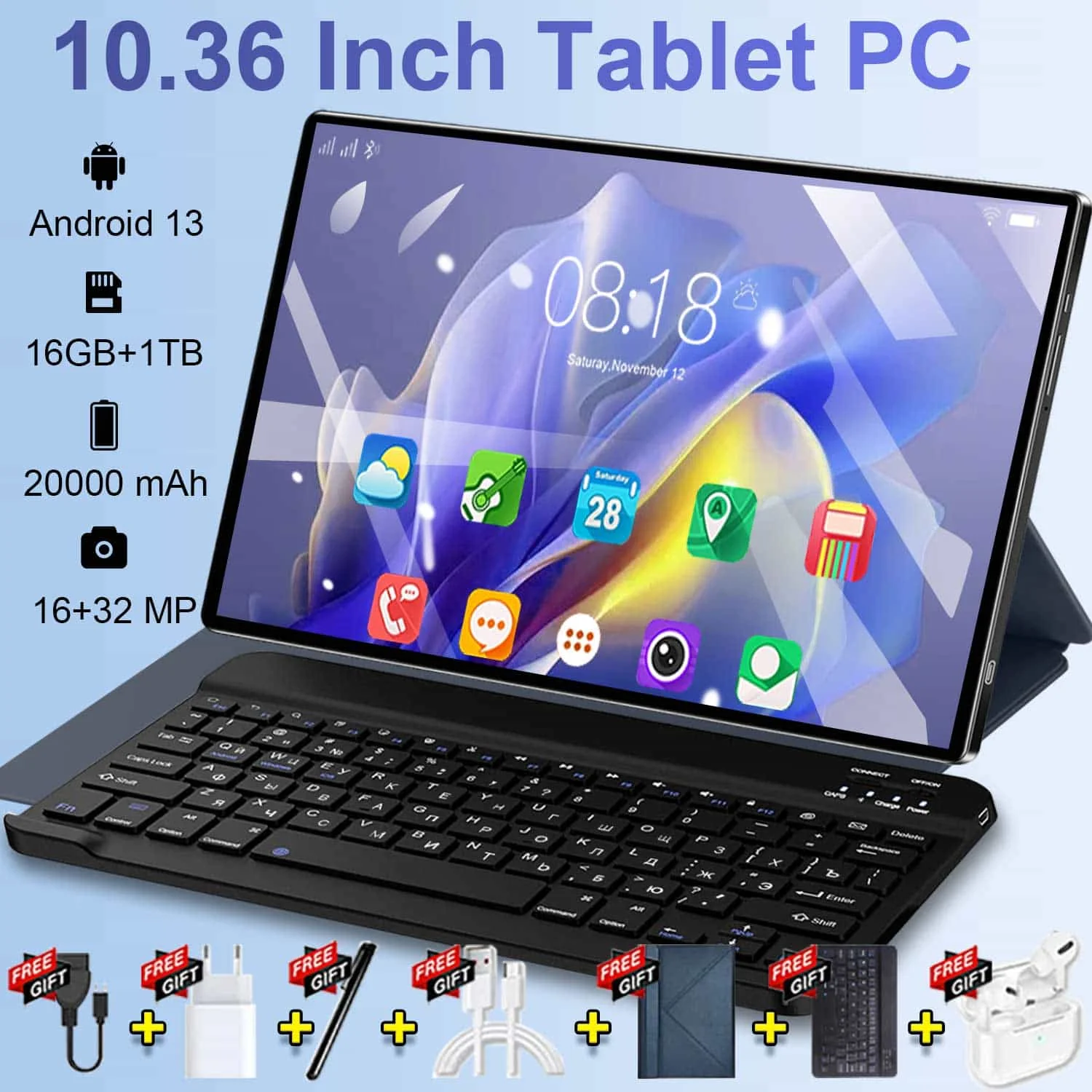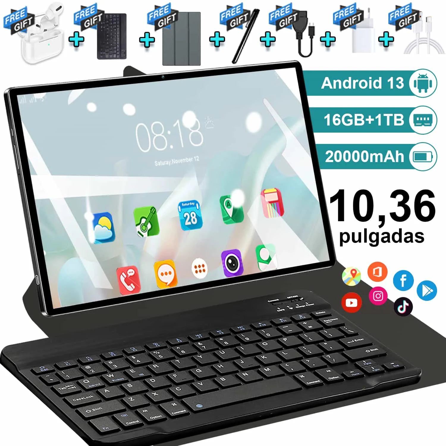 2026 5G Tablet 10,36 "Android 13 pantalla IPS 16GB RAM 1TB ROM 20000mAh batería WiFi Bluetooth para uso en pantalla extendida