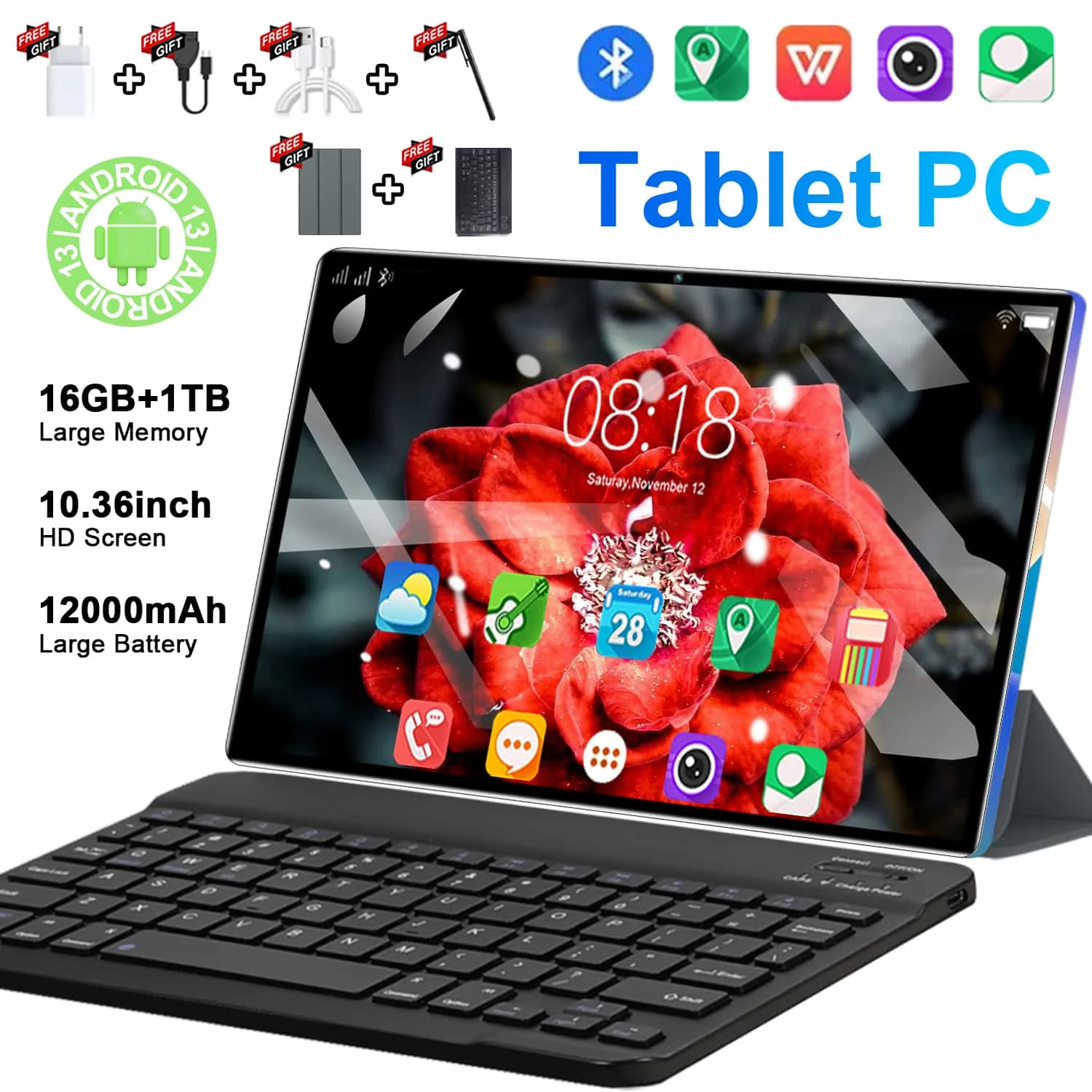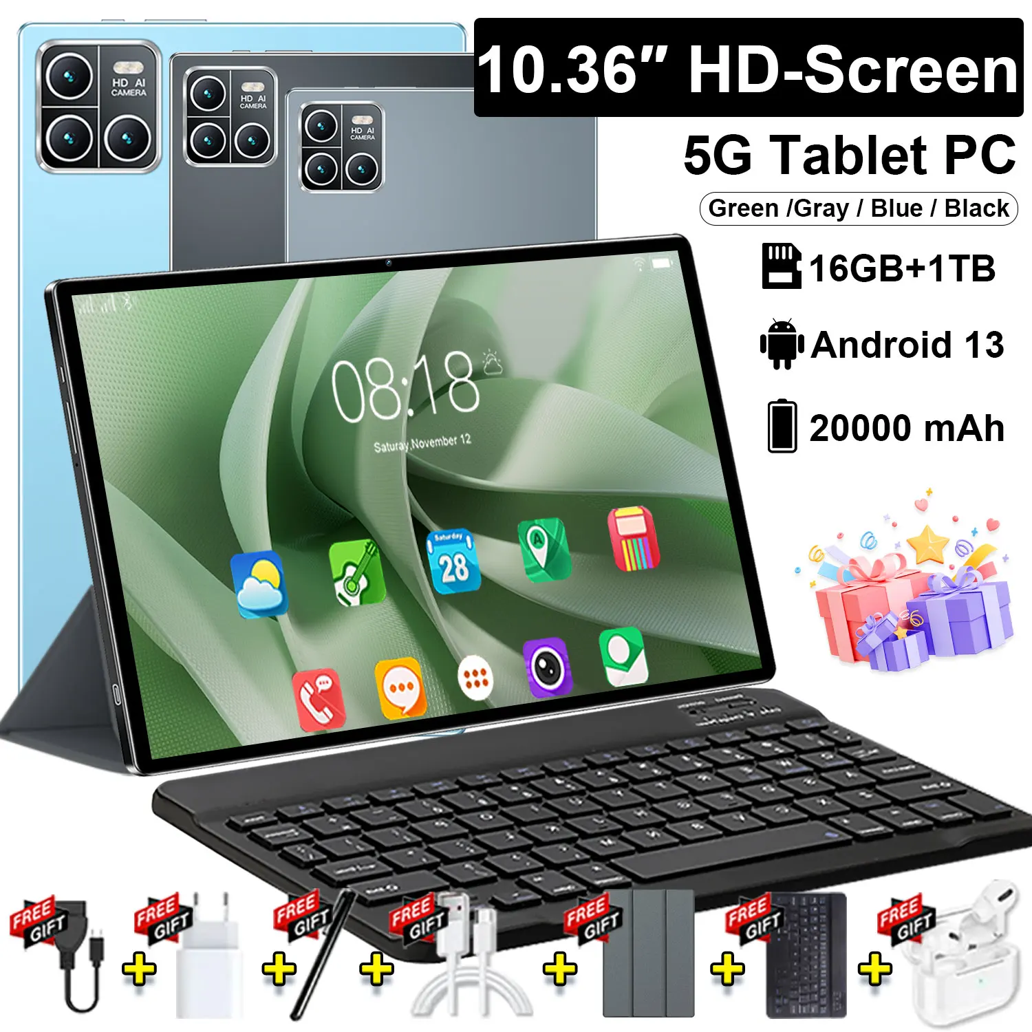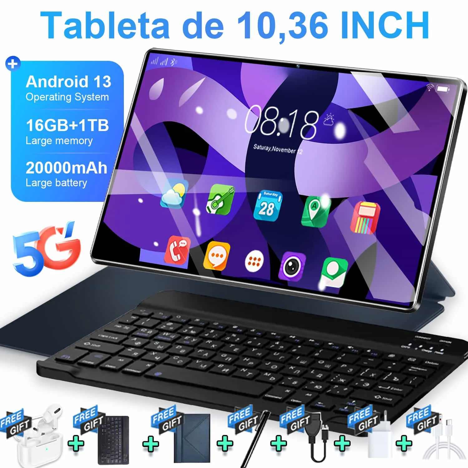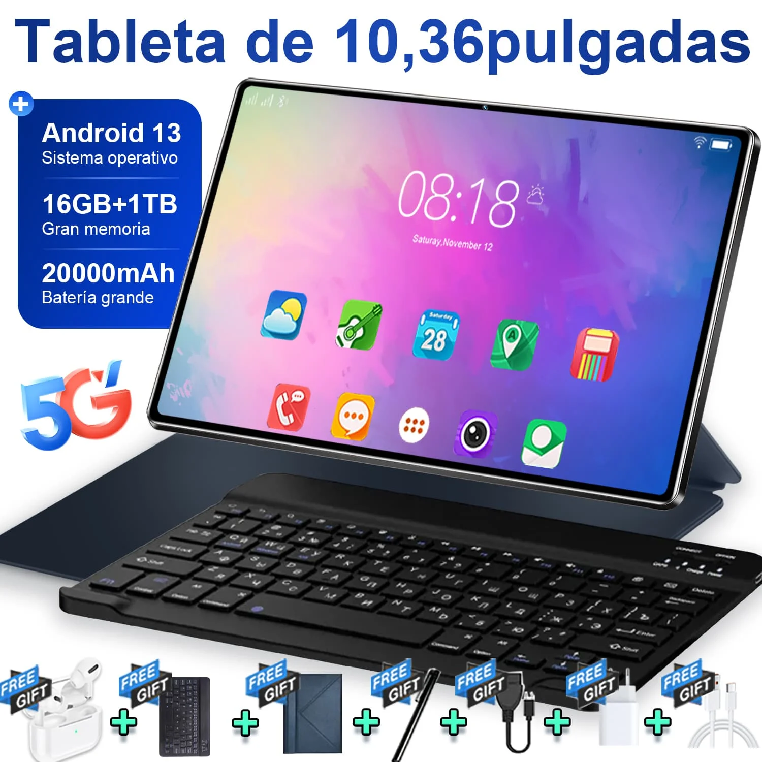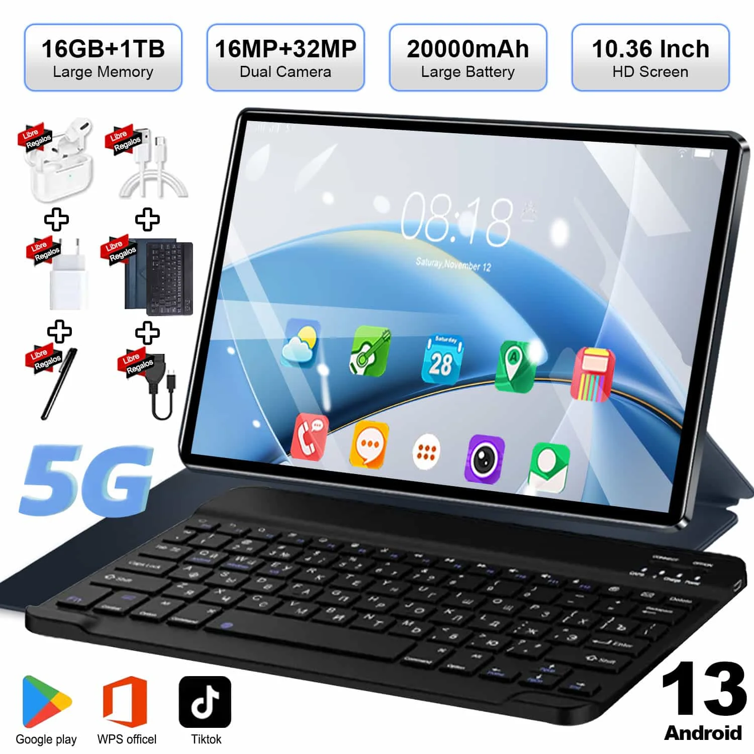 Tableta Android 13 5G de 10,36 pulgadas, pantalla IPS 2025, 4K, 12GB de RAM, 512GB de almacenamiento, batería de 20000mAh, doble SIM, WiFi, BT, conectividad