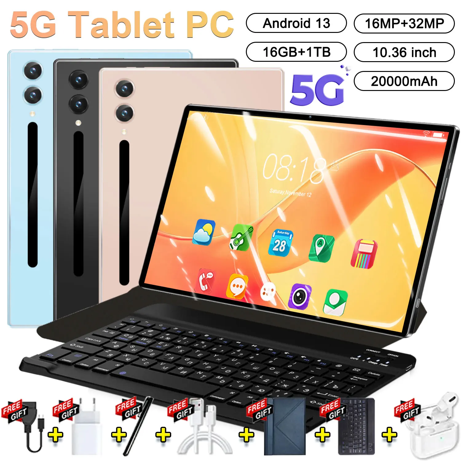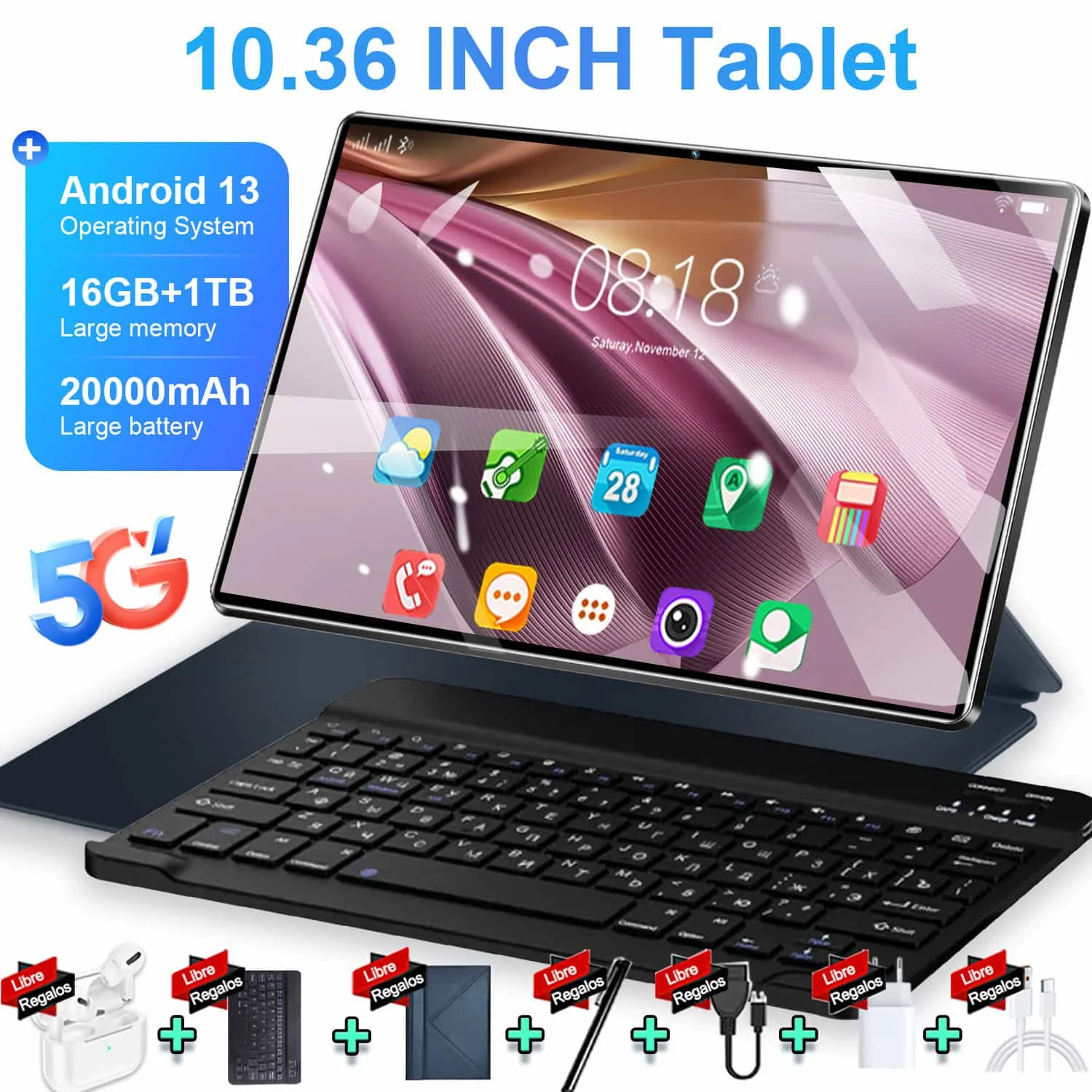 Tableta IPS de 10,36 pulgadas, 5G, Android 13, 16GB + 1TB, Ultra almacenamiento, batería de 20000mAh, WiFi BT para multitarea sin esfuerzo