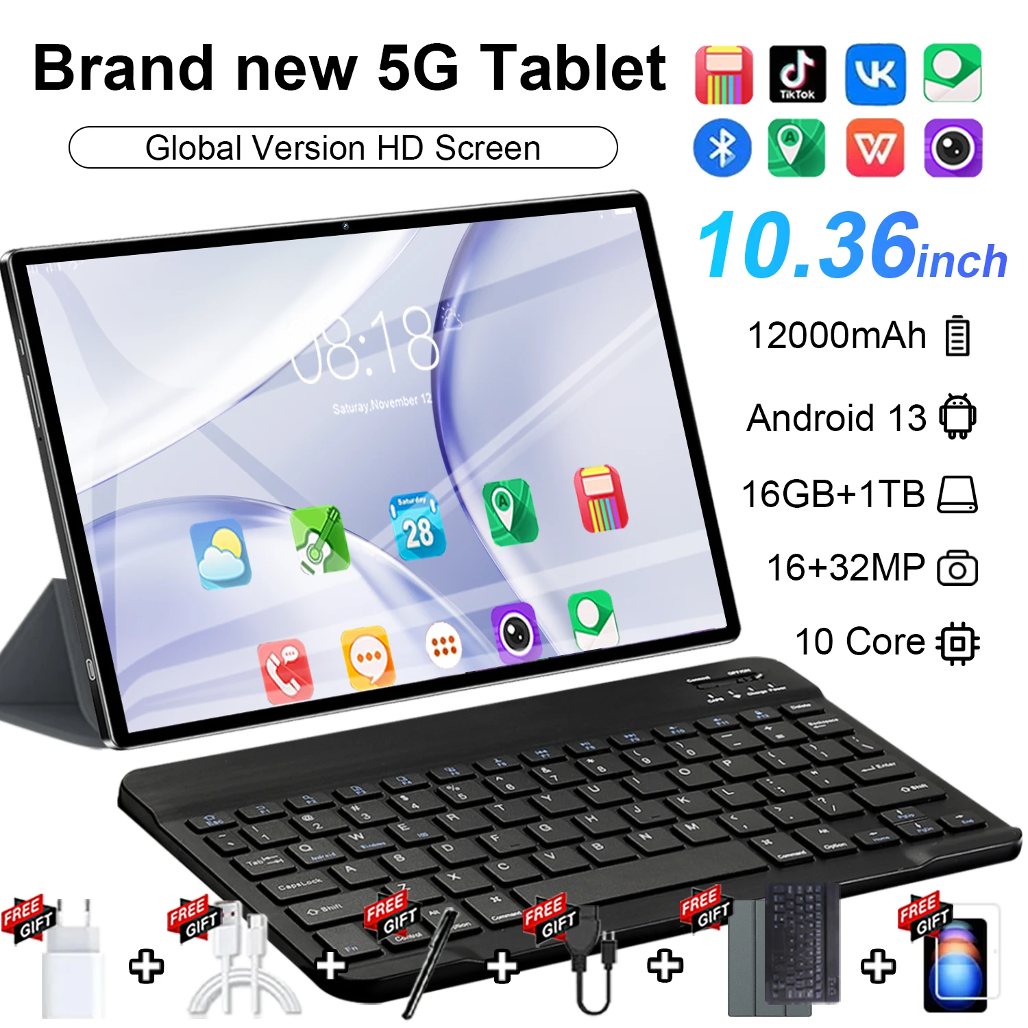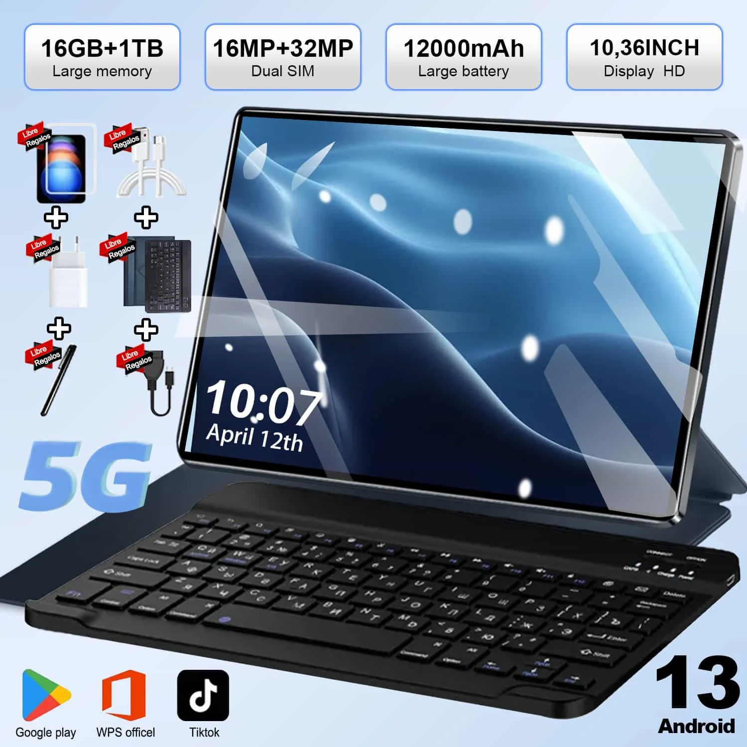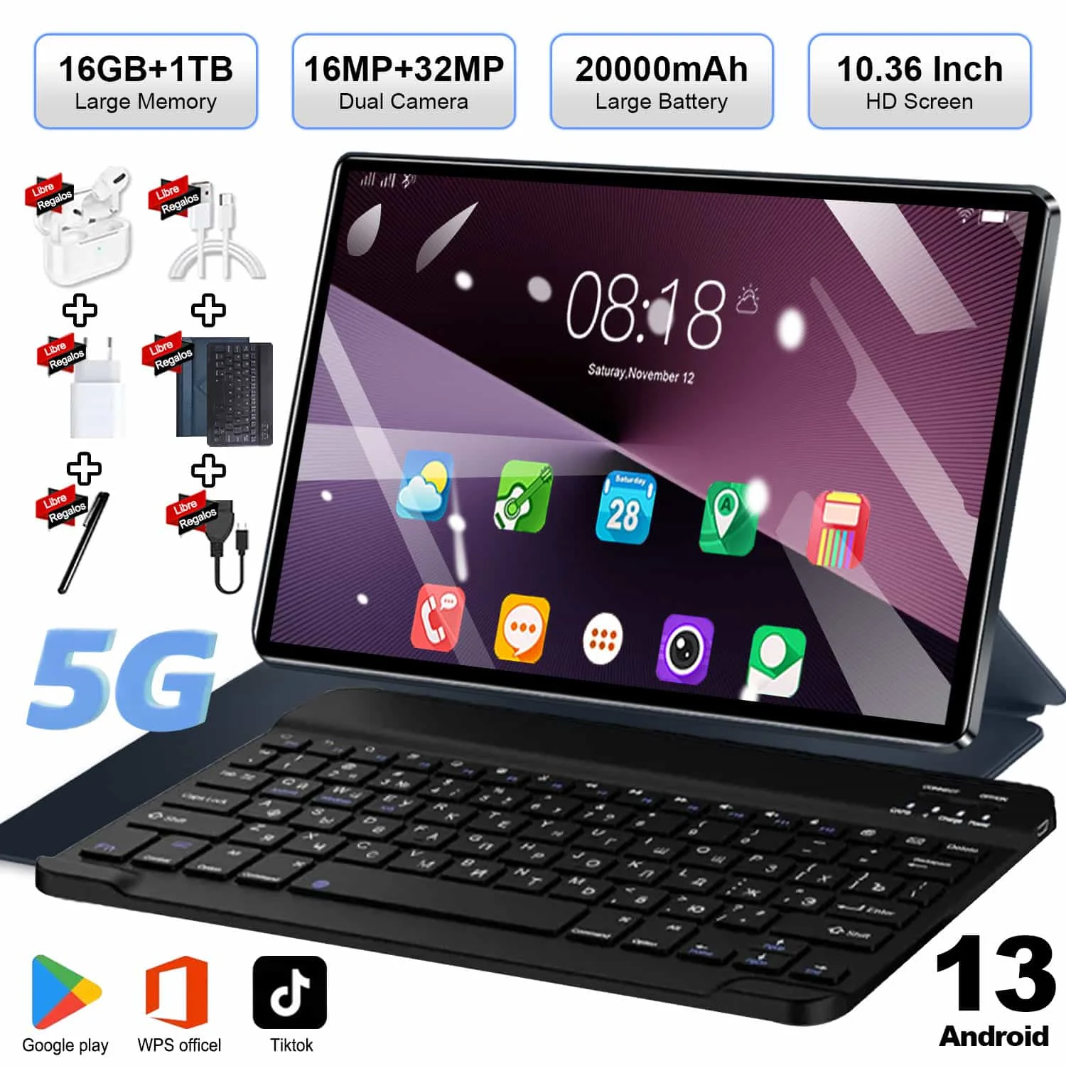 2025 Tableta 5G de alta velocidad 10,36 "Android 13 Pantalla IPS 16GB + 1TB Almacenamiento 20000mAh Batería WiFi BT para productividad Viajes Estudio