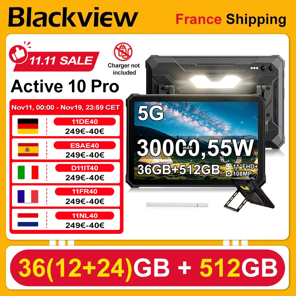 Blackview Active 10 Pro [Sin cargador de la UE] Tableta robusta 36(12+24)GB + 512GB 11,0" 30000mAh PC 108MP Dual SIM 5G