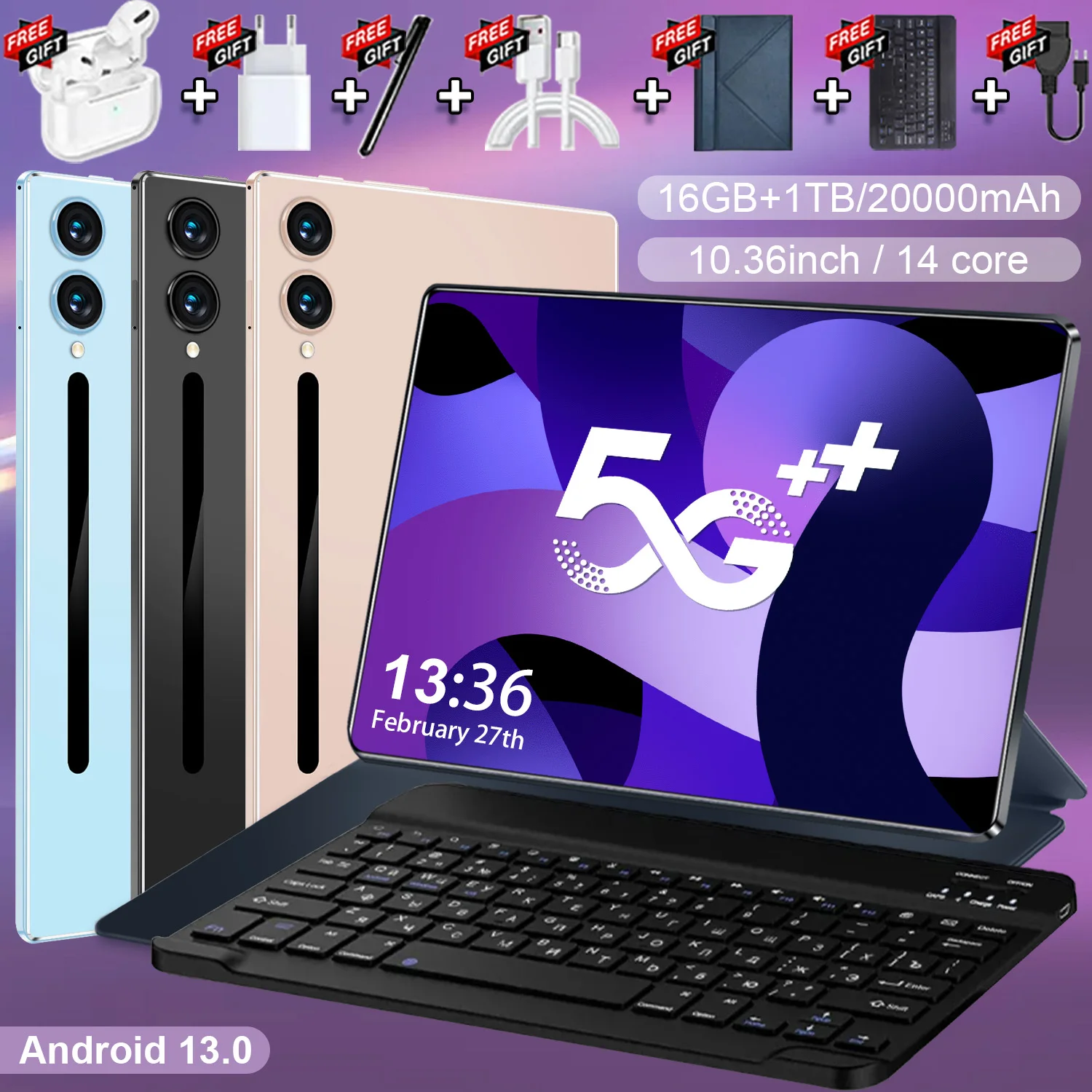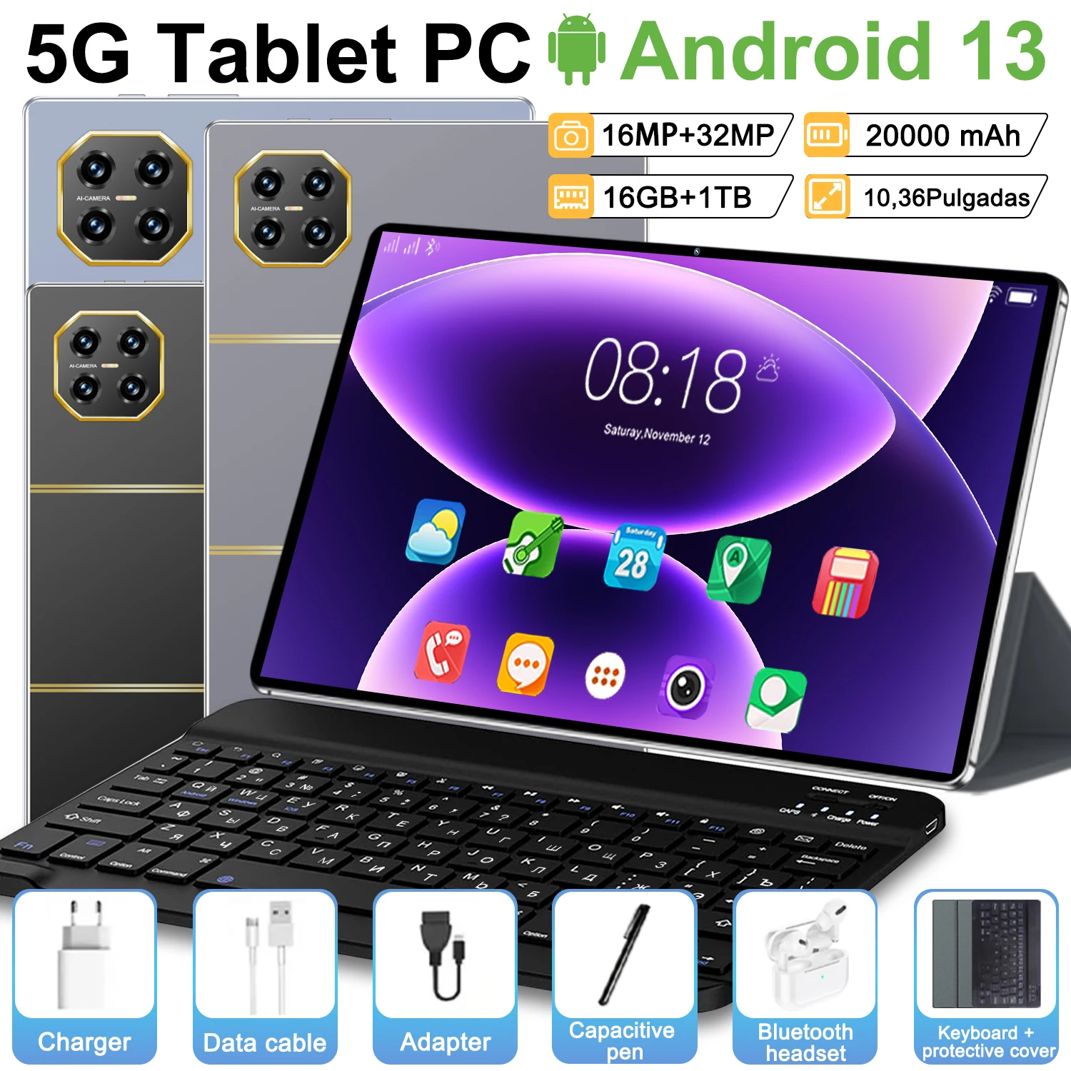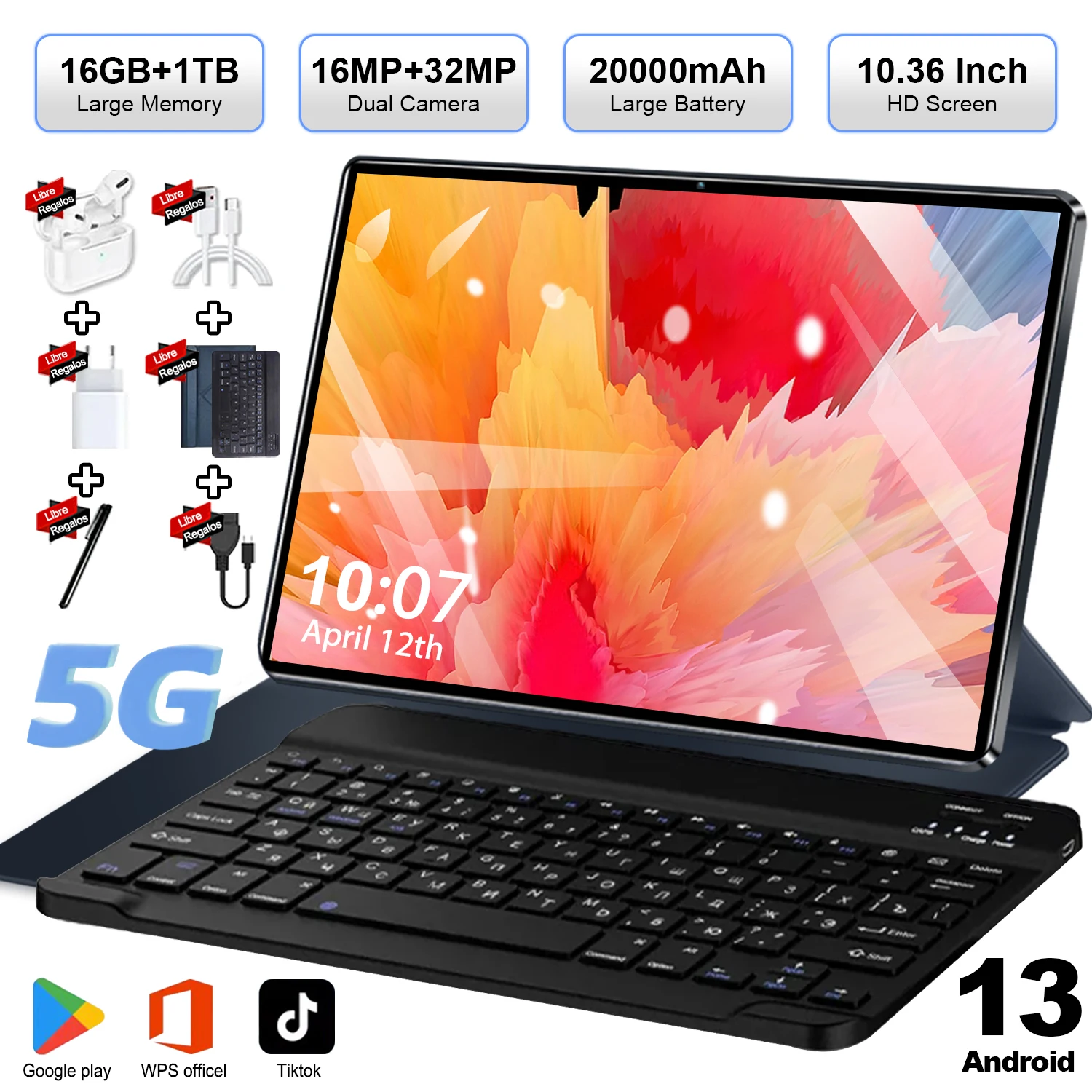 Tablet Original 2026 con Android 13, Pantalla de 10.36 Pulgadas, 16GB + 1TB, 20000mah, 5G, Doble SIM, WIFI, 14 Núcleos, Pantalla HD Completa, Red Global, GPS