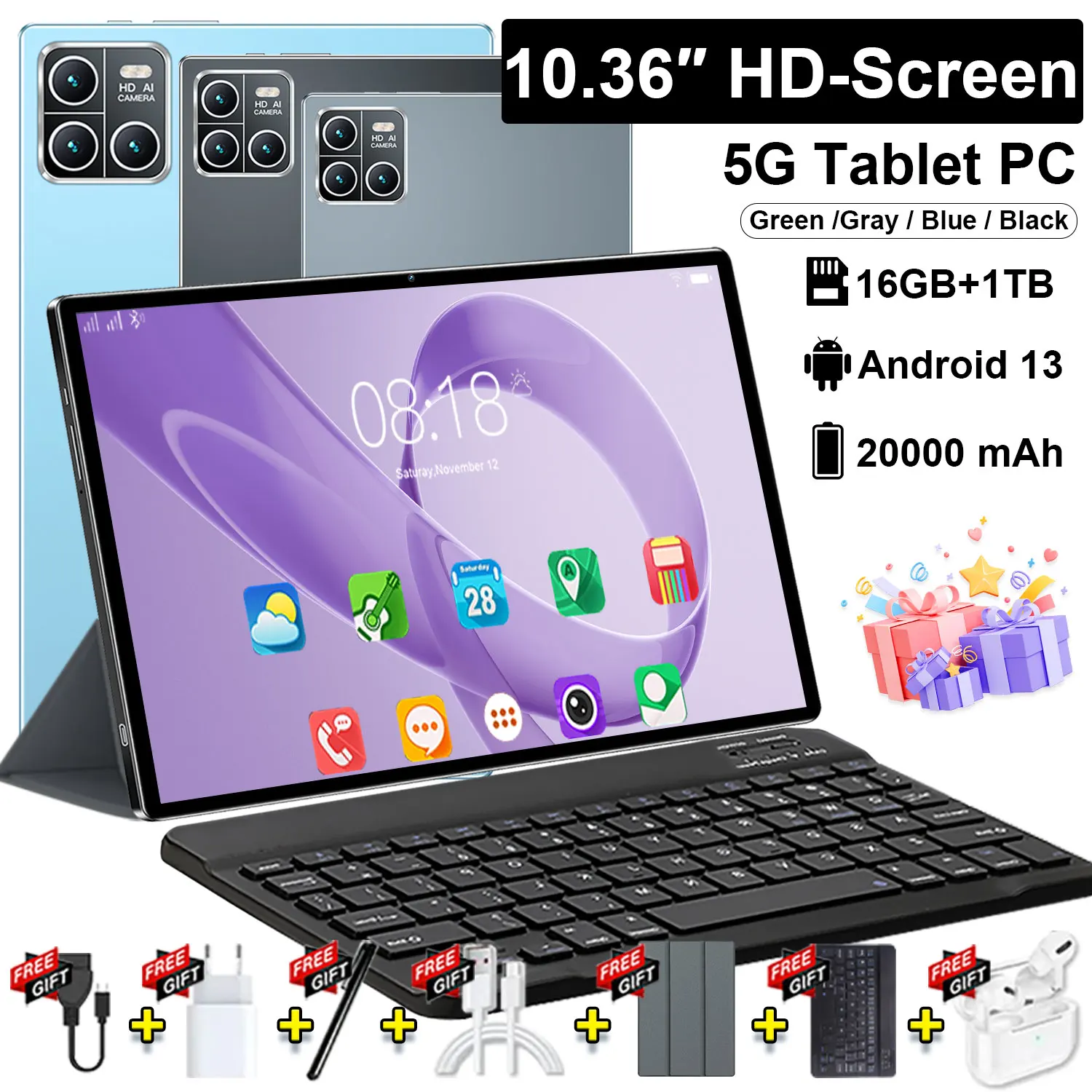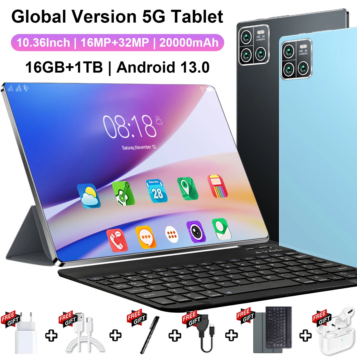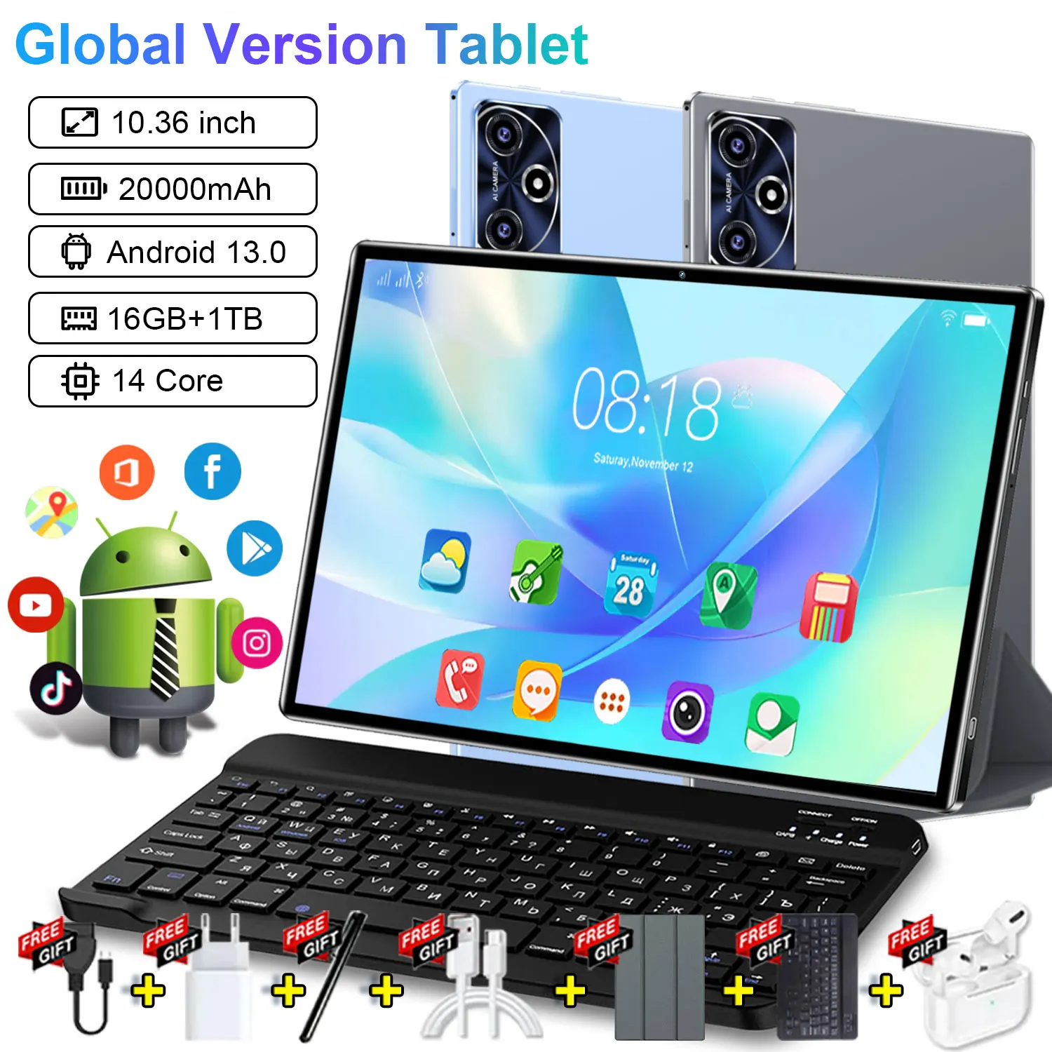 Tablet Original 2026 con Android 13, Pantalla de 10.36 Pulgadas, 16GB + 1TB, 20000mah, 5G, Doble SIM, WIFI, 14 Núcleos, Pantalla HD Completa, Red Global, GPS