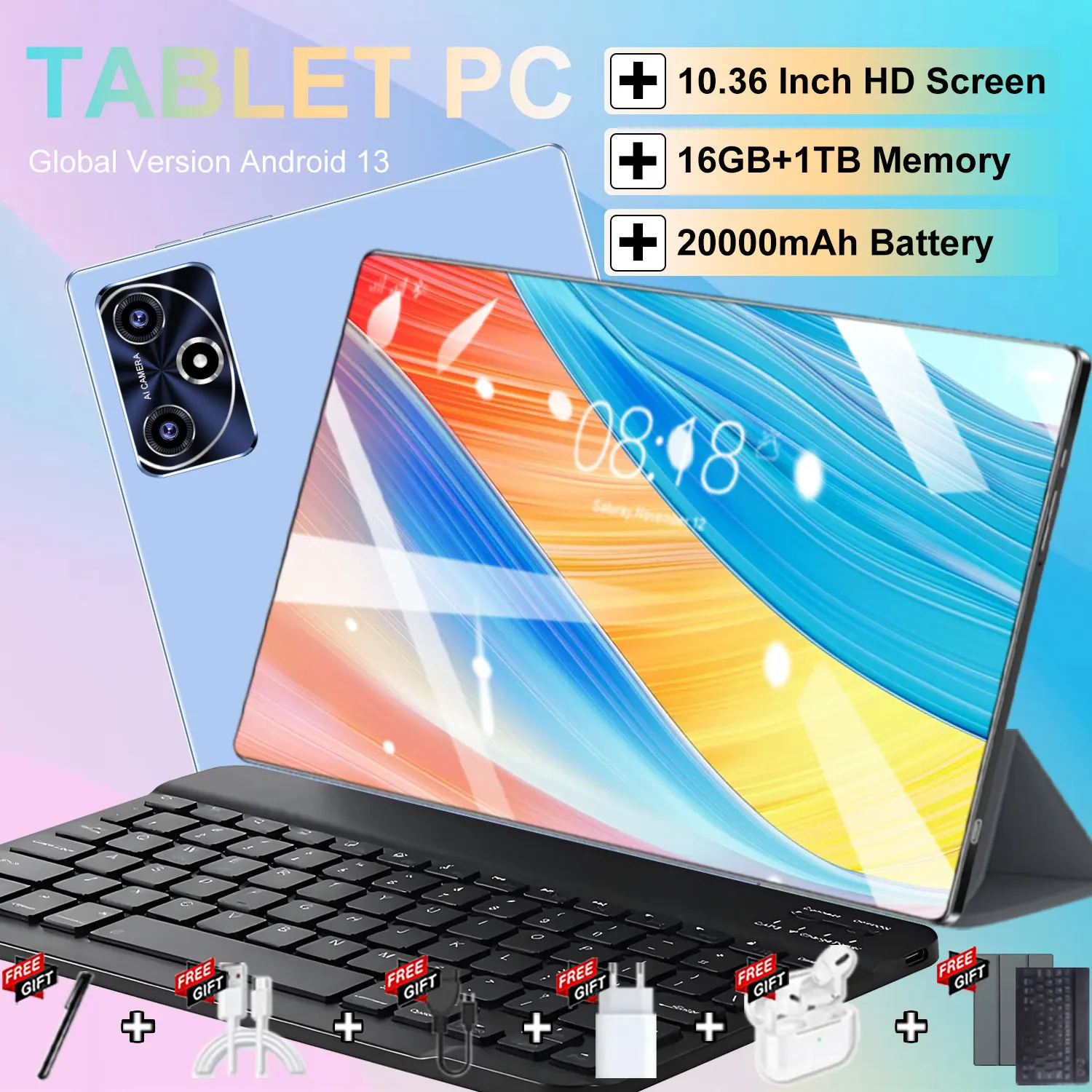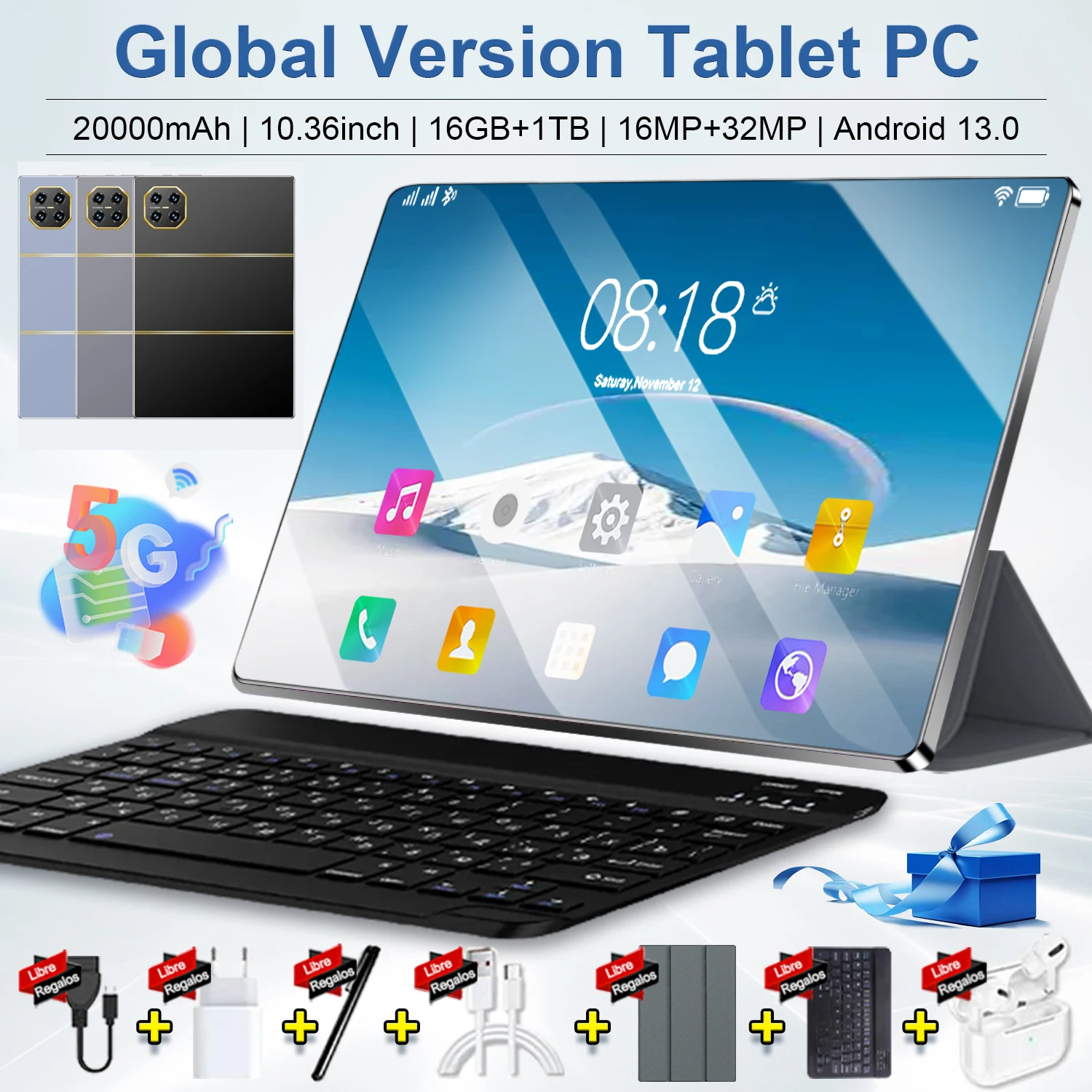 Tablet Original 5G con Android 13, 16 GB de RAM, 1 TB de ROM, pantalla de 10.36 pulgadas, batería de 20000 mAh, Bluetooth, 14 núcleos, WIFI, Office, GPS, HD, con teclado.