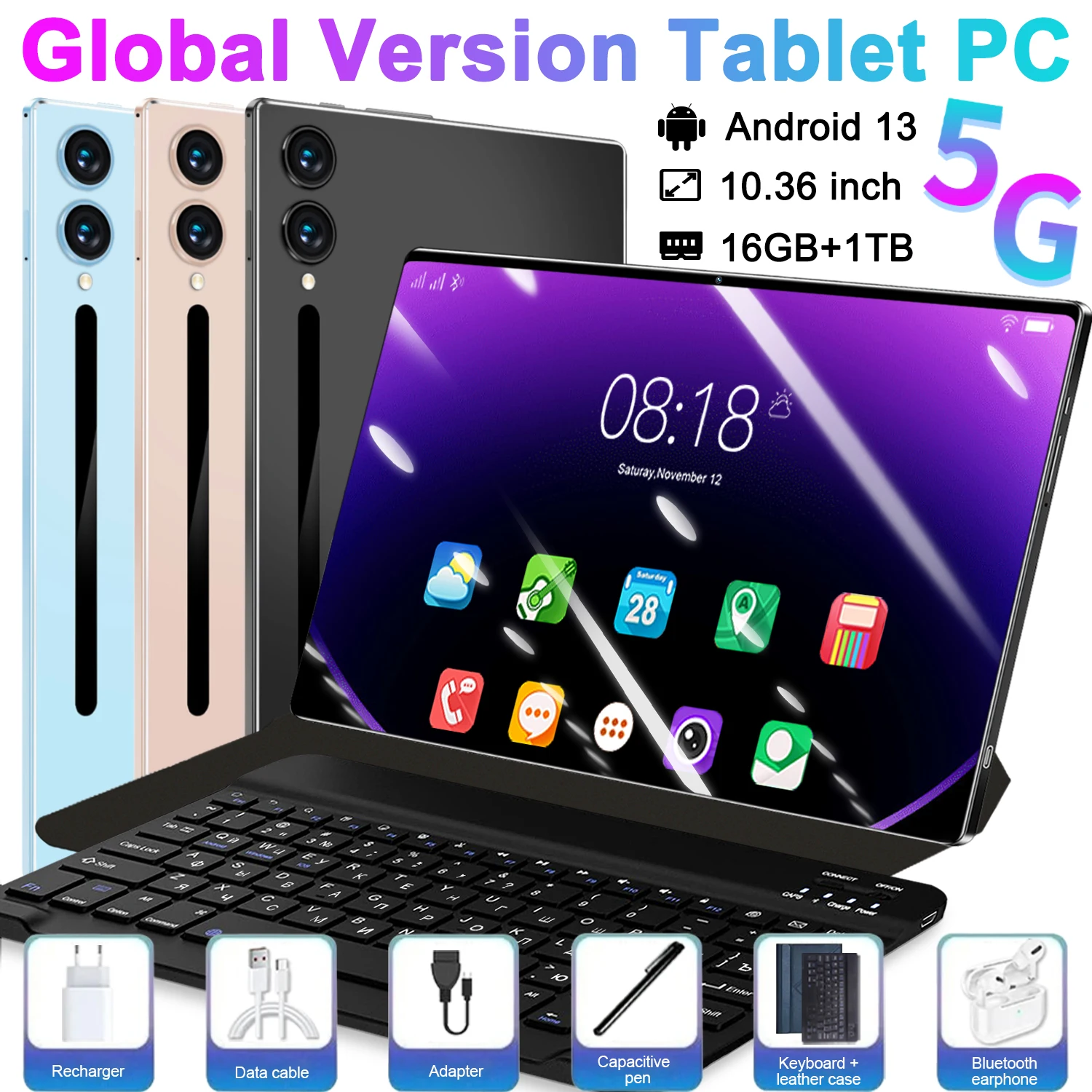 Tablet PC Android 13.0 de 10.36 Pulgadas con Google Play, Cámaras Duales, 14 Núcleos, Doble SIM, 5G, Bluetooth, Wifi, 16GB + 1TB ROM