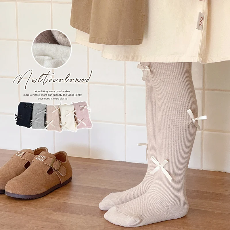 Medias a rayas acanaladas de invierno para niñas de 0 a 12 años, pantimedias con lazo de lana de algodón, mallas elásticas de punto suaves y cálidas para niños Kawaii