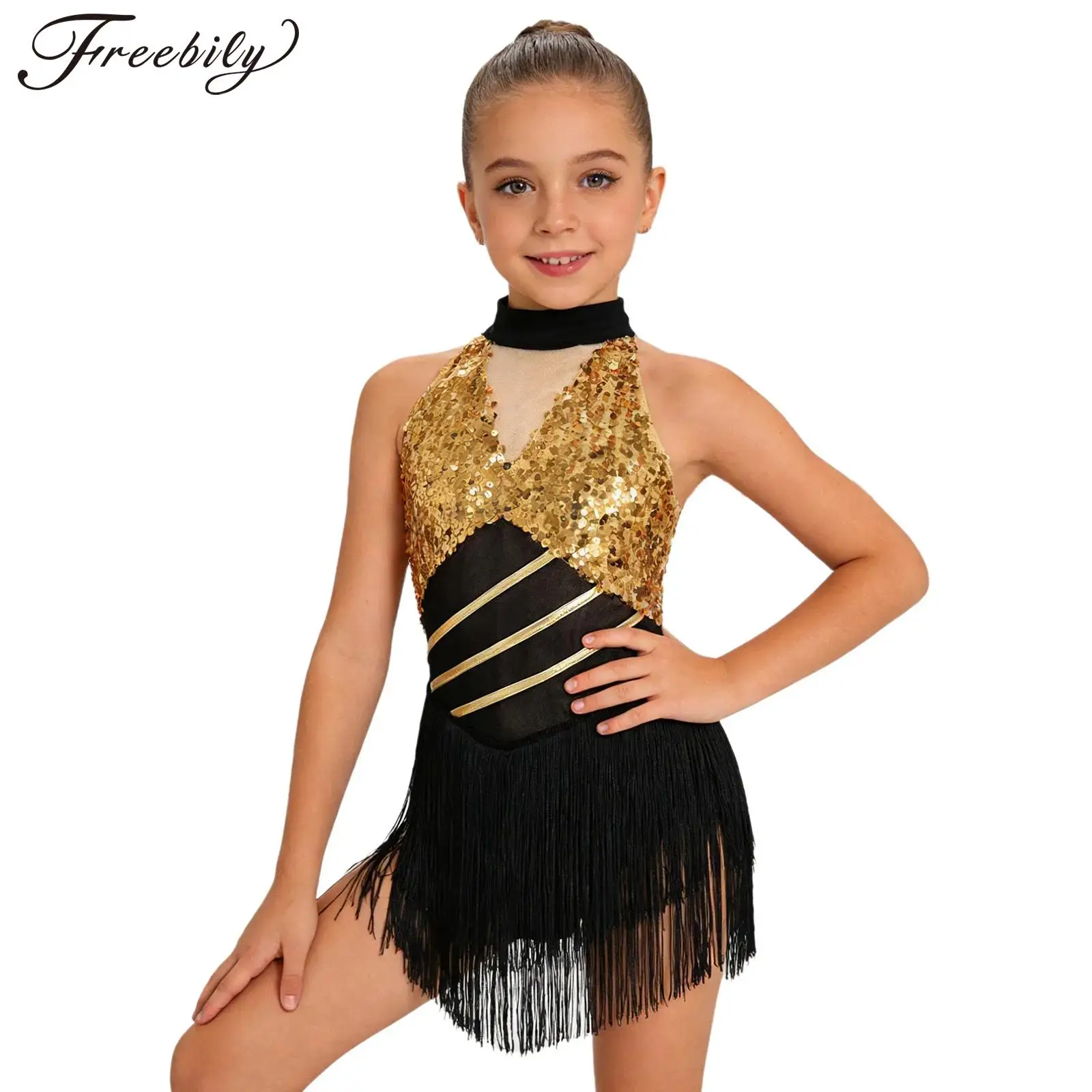 Traje de Danza para Niñas, Estilo Halter, para Cha-cha, Salsa, Baile Latino y Ballet, con Lentejuelas, Sin Mangas, Malla en la Cintura, Abertura en la Espalda y Borlas, Leotardo