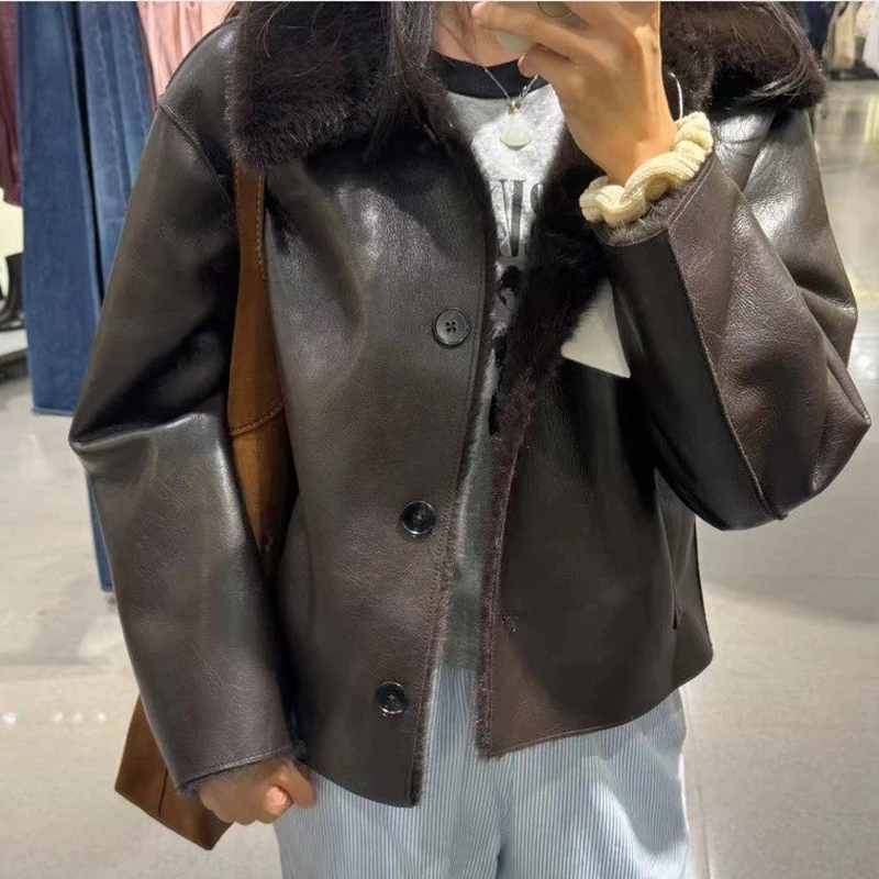 2025 invierno nuevo producto mujer estilo Casual cuello abatible manga larga doble cara PU imitación cuero Chaqueta corta abrigo