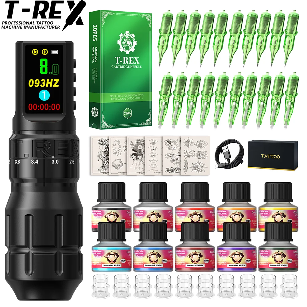 Máquina de tatuaje inalámbrica t-rex, Kit de pluma giratoria, Motor personalizado de carrera ajustable, batería de pantalla LCD de 1800mAh, pluma de maquillaje para juego de tatuaje