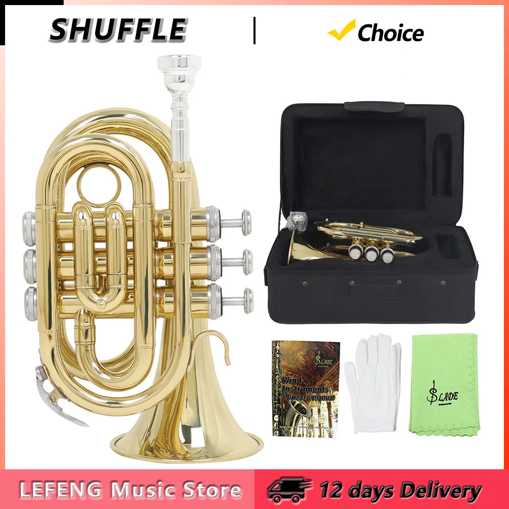 SHUFFLE Bb Mini trompeta de bolsillo B Cuerpo plano de latón Cornet con funda Correa Guante Boquilla de tela Instrumentos profesionales de latón