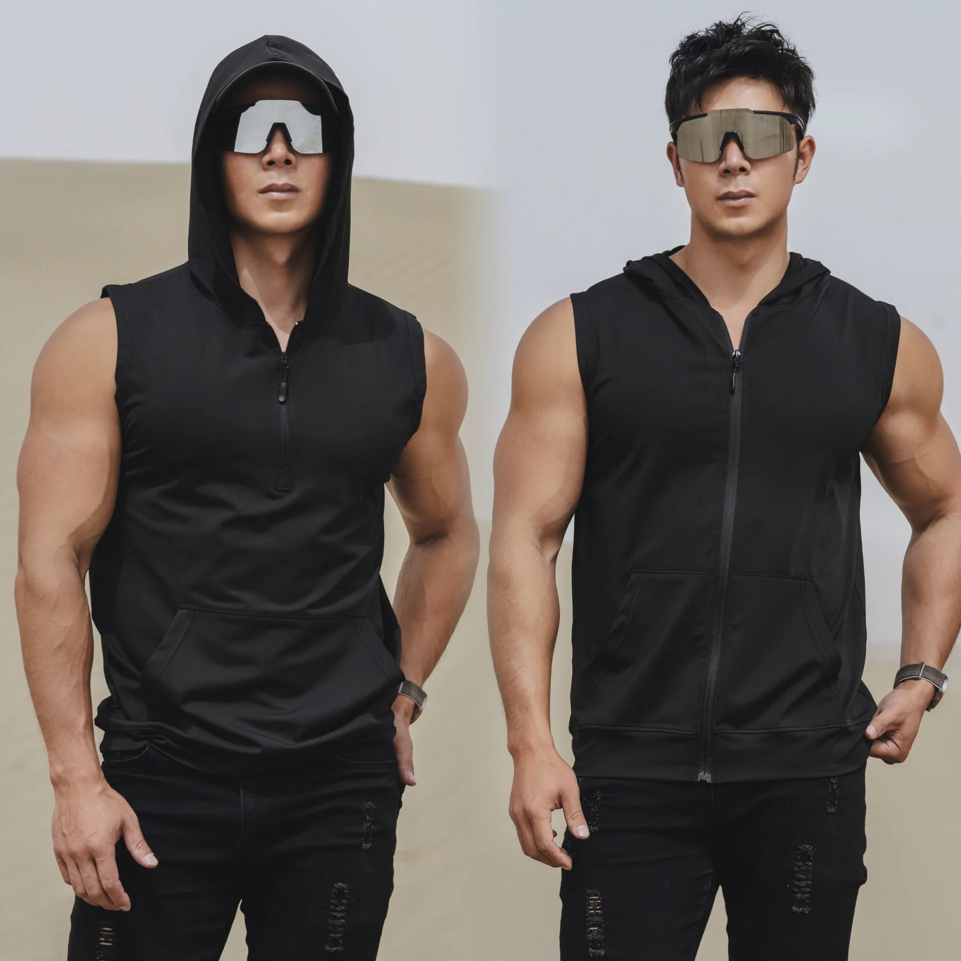 1 unidad Chaleco con capucha para hombre 2026 de seda helada de secado rápido, con cremallera parcial, corte ajustado, realce muscular, sin mangas, para correr y fitness