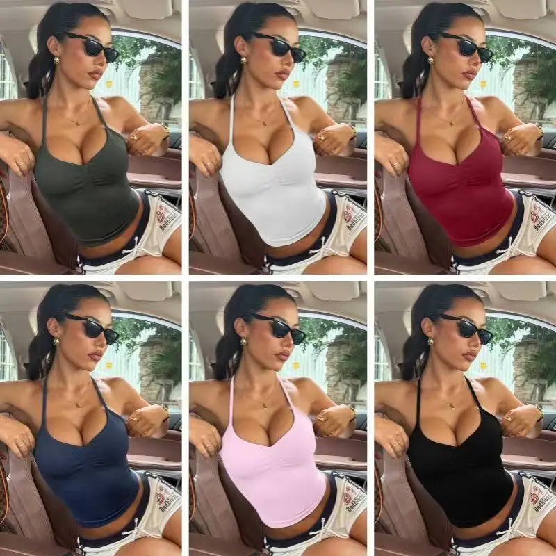 Top deportivo ajustable con tirantes, sin espalda, para mujer, con sujetador fruncido y copas extraíbles, ideal para yoga y entrenamiento, tipo chaleco deportivo.