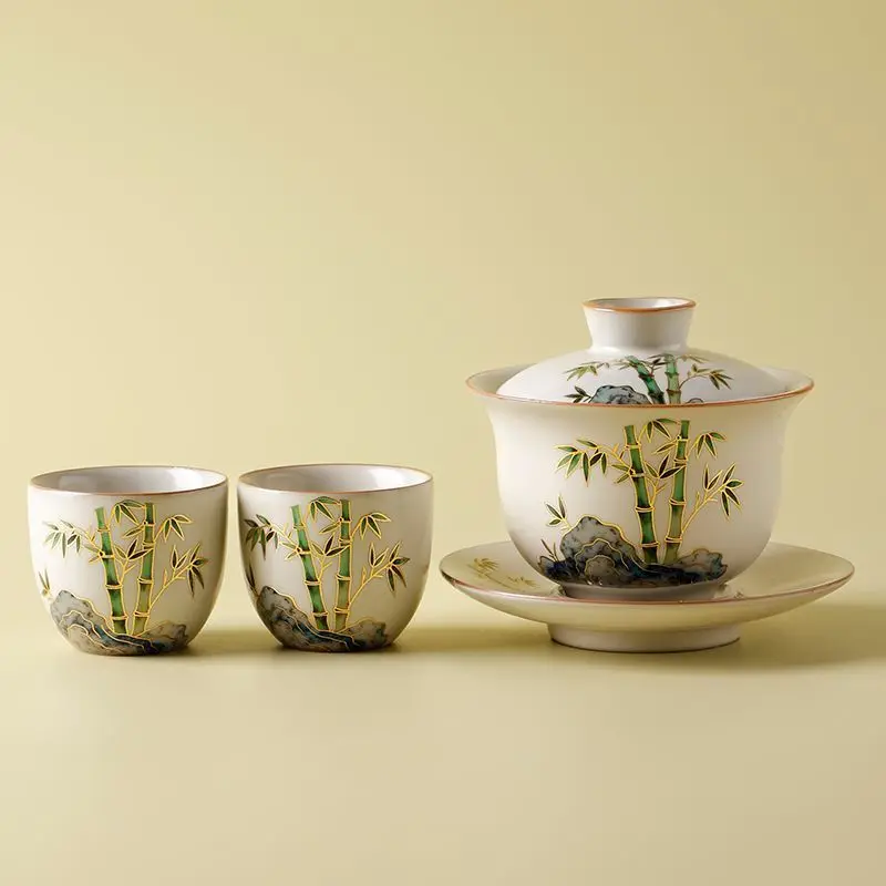 Juego de Té Gaiwan, 1 Gaiwan, 2 Tazas, Cerámica Pintada a Mano, Juego de Té Kung Fu de Alta Gama, Vajilla de Cerámica Ru Kiln