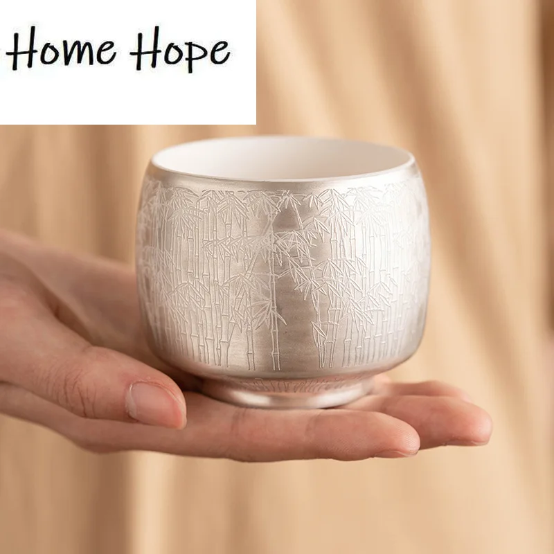 Taza de té de cerámica de plata dorada 999 de alta gama, taza maestra con patrón de bambú verde, tazón de té Personal, servicio de té especial Chazhan para beber